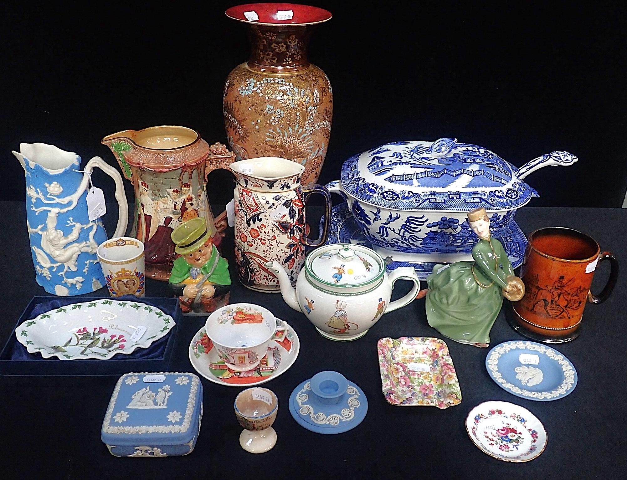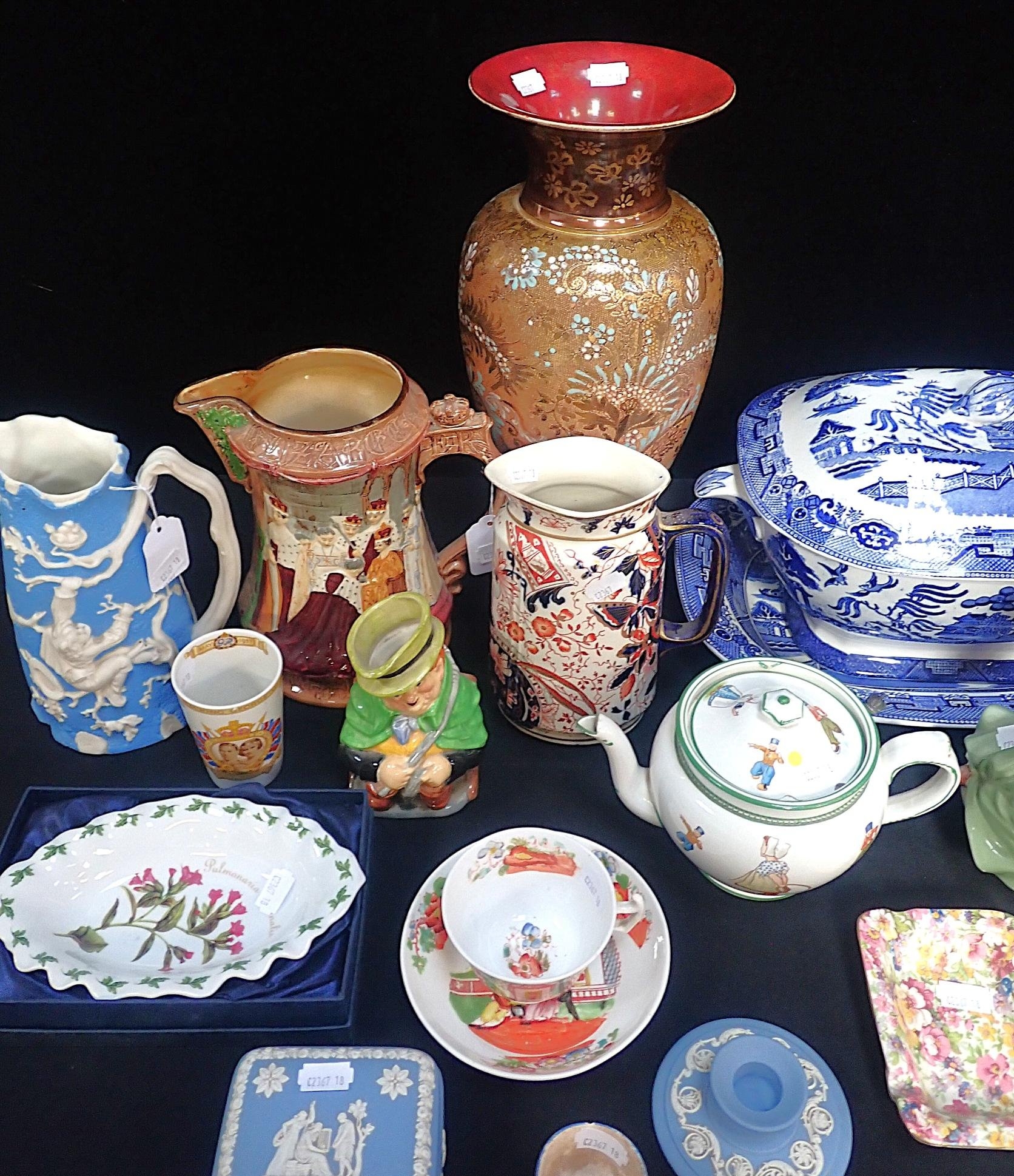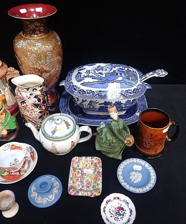 decorated with Dutch children, and other ceramics including a large Doulton Slater's patent vase, a Victorian willow tureen with ladle, a Burleigh Ware Coronation jug, and other items