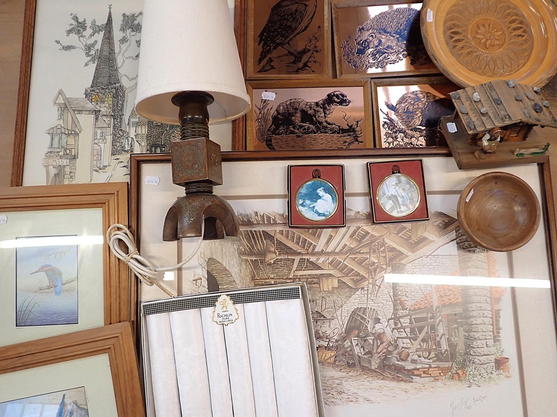 a chip-carved Scandinavian wooden lamp, a Michael Cooper print, 381/850, other pictures and sundries