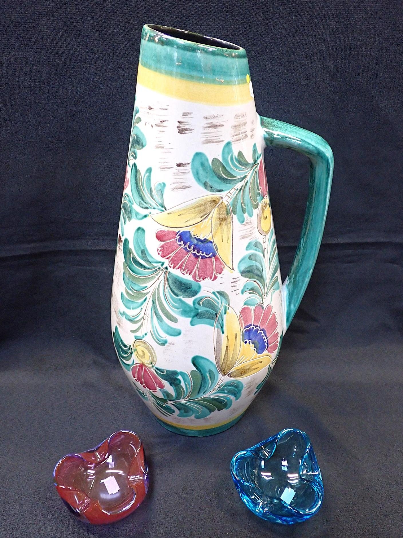 brightly painted, marked 'Foreign 270-50' possibly Scheurich Keramik, 51cm high, and two art glass ashtrays (3)