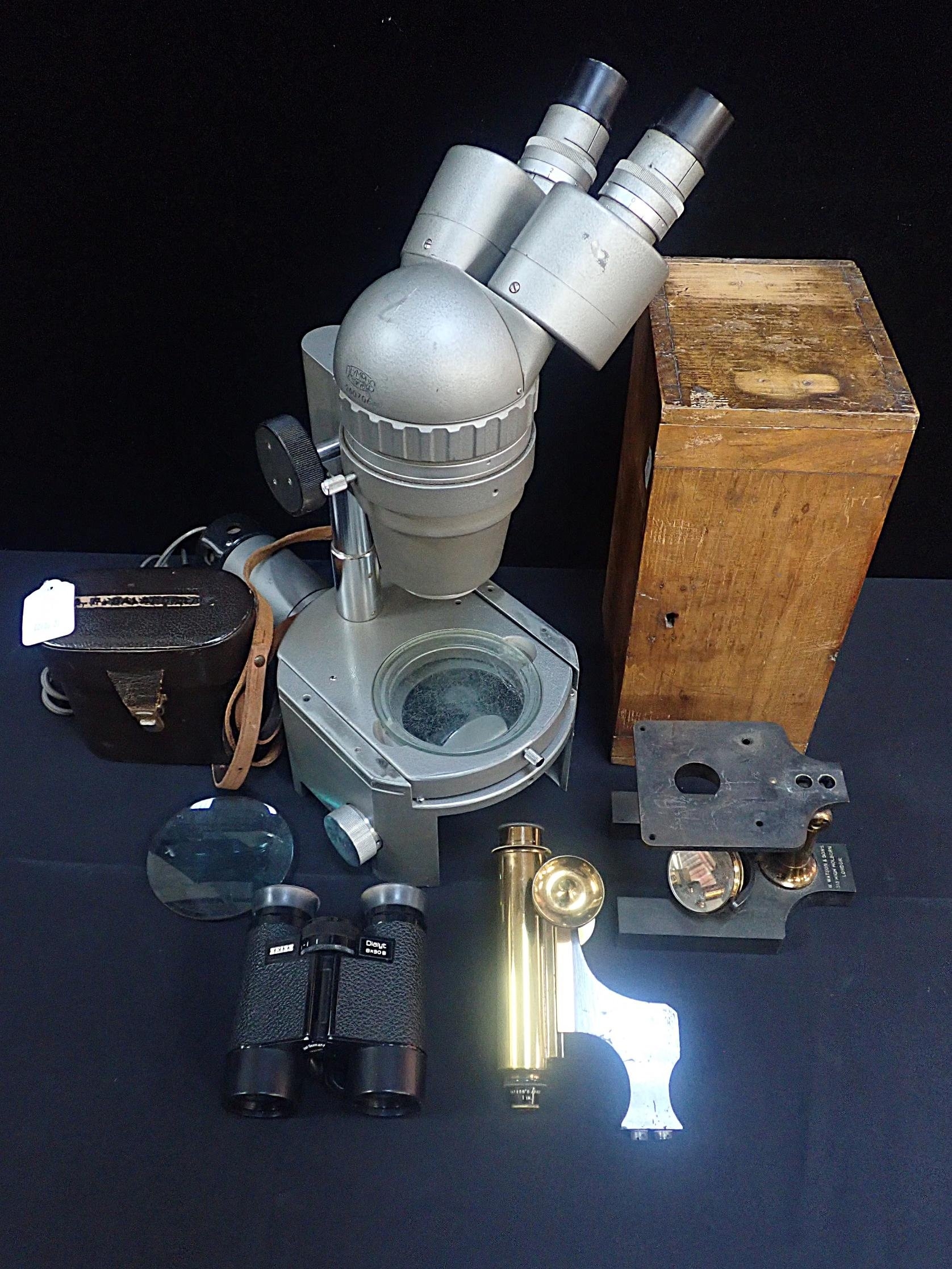on illuminated stand, a W. Watson and Sons microscope (both a/f), and a pair of Zeiss binoculars (3)