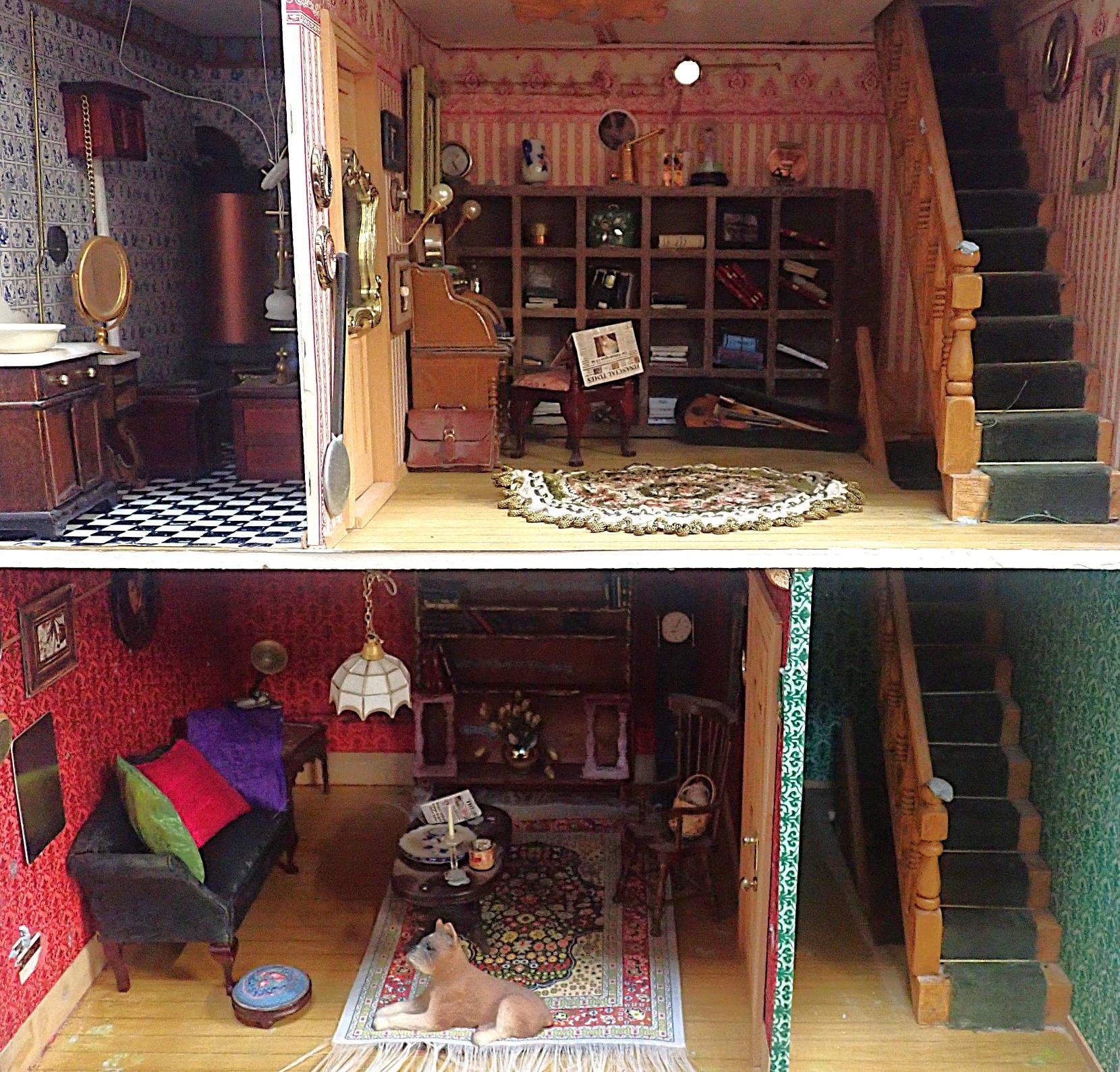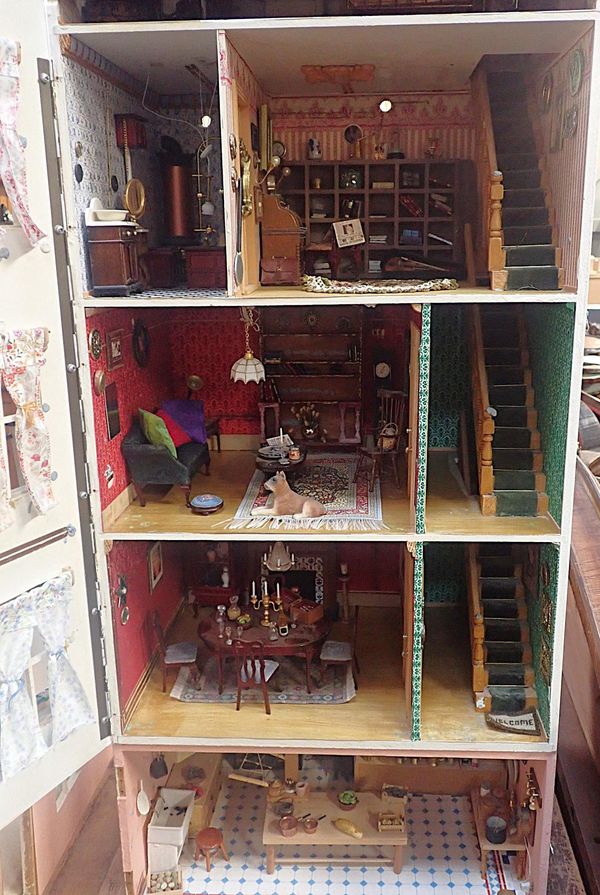 made circa 1975 in the form of a 19th century town house with basement kitchen and 'area', three main storeys and attic, filled with a variety of commercially made furniture and effects, 122cm high, 46cm wide, 56cm deep (at base) (some repairs required)
