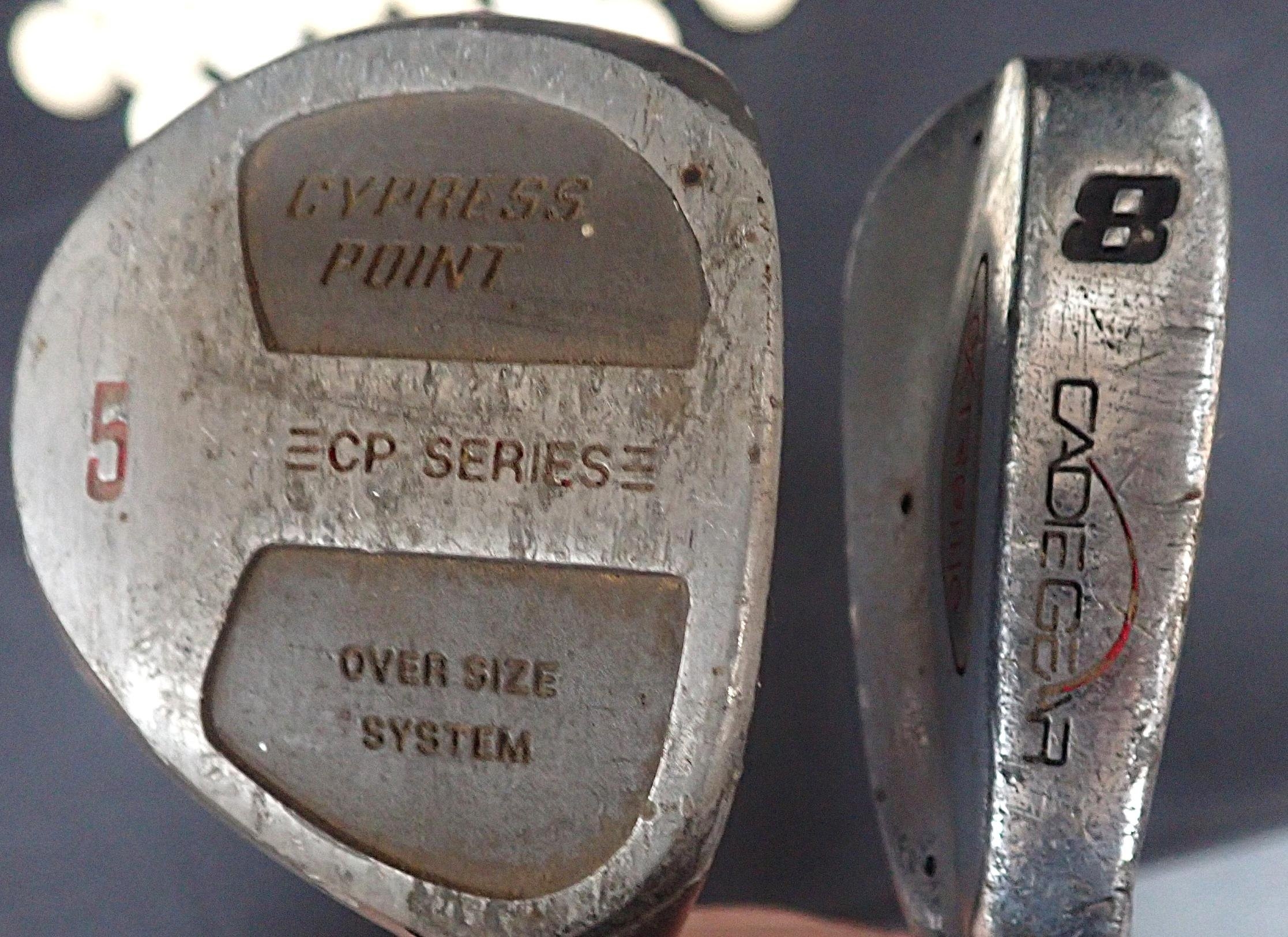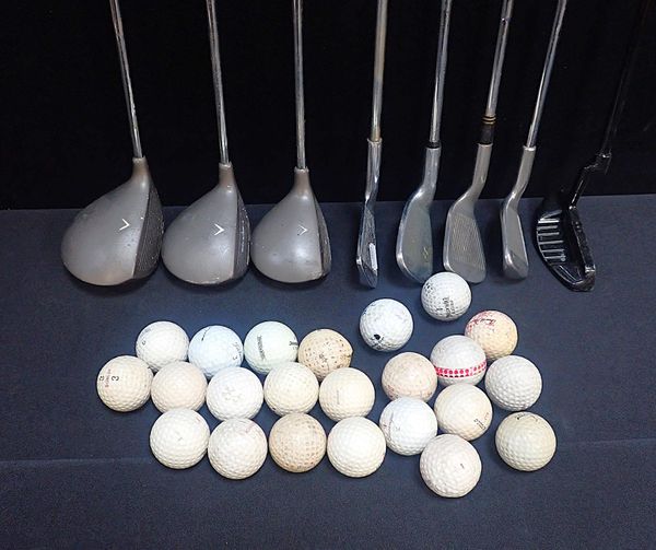1, 3 and 5 wood with steel shaft, with four various irons and a putter, with a small quantity of used golf balls (8)