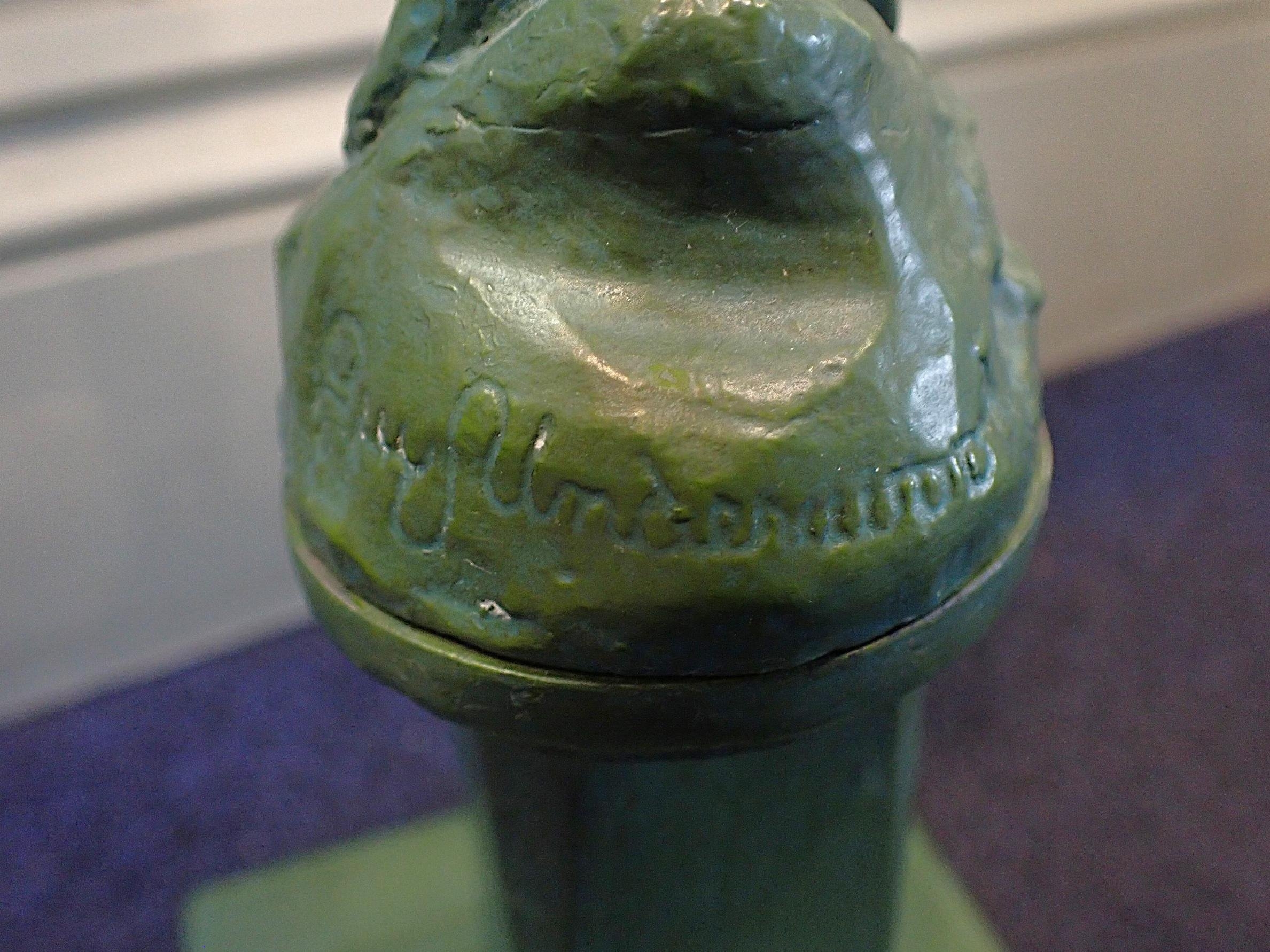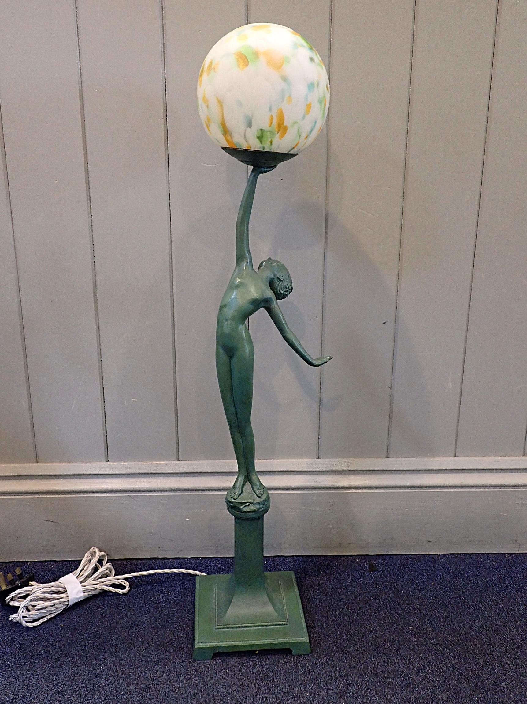 cast spelter, with verdigris coloured paint finish, and mottled glass globe, 77cm high (not tested)