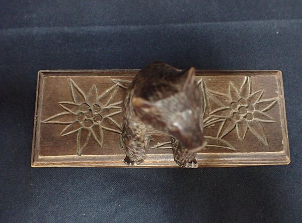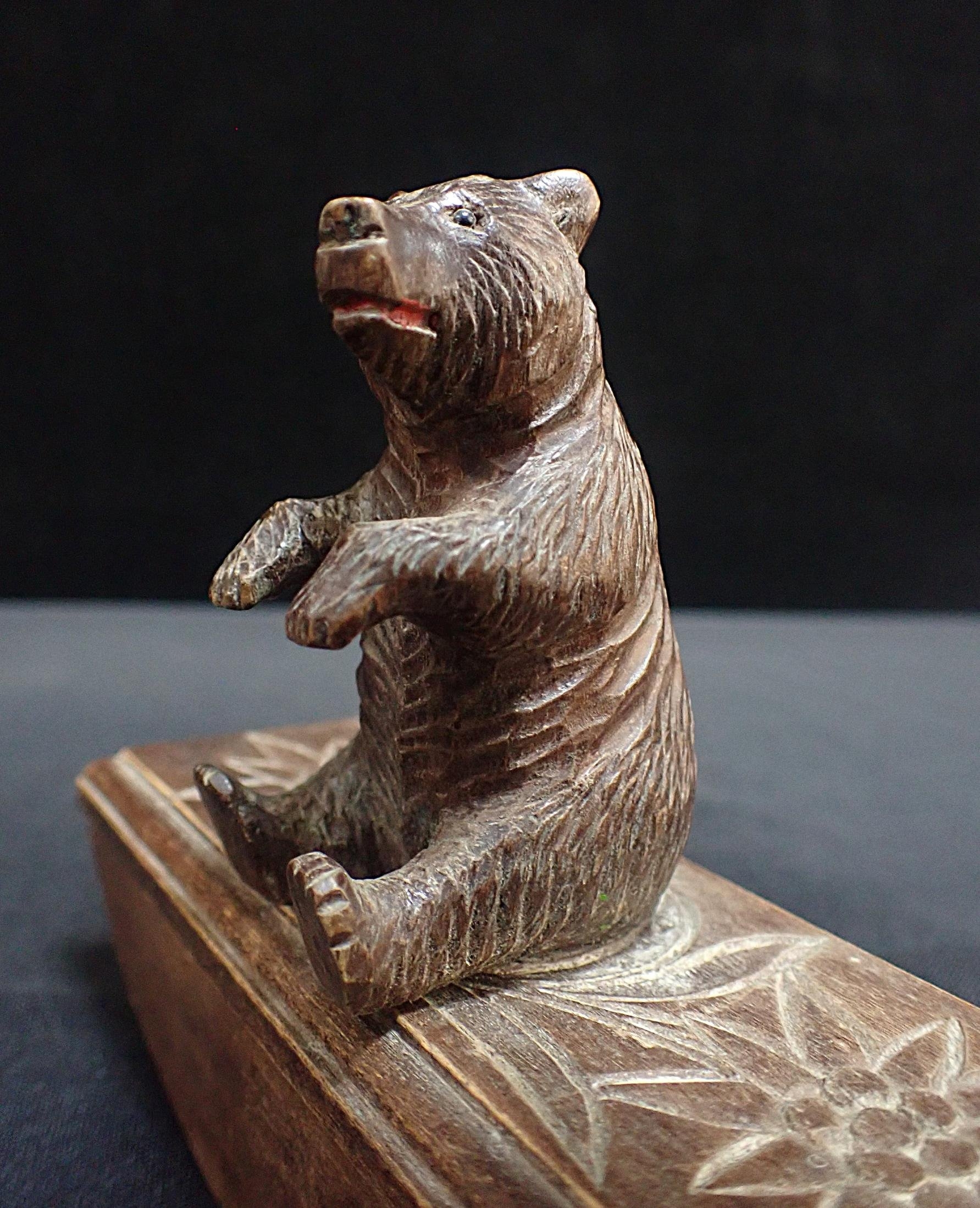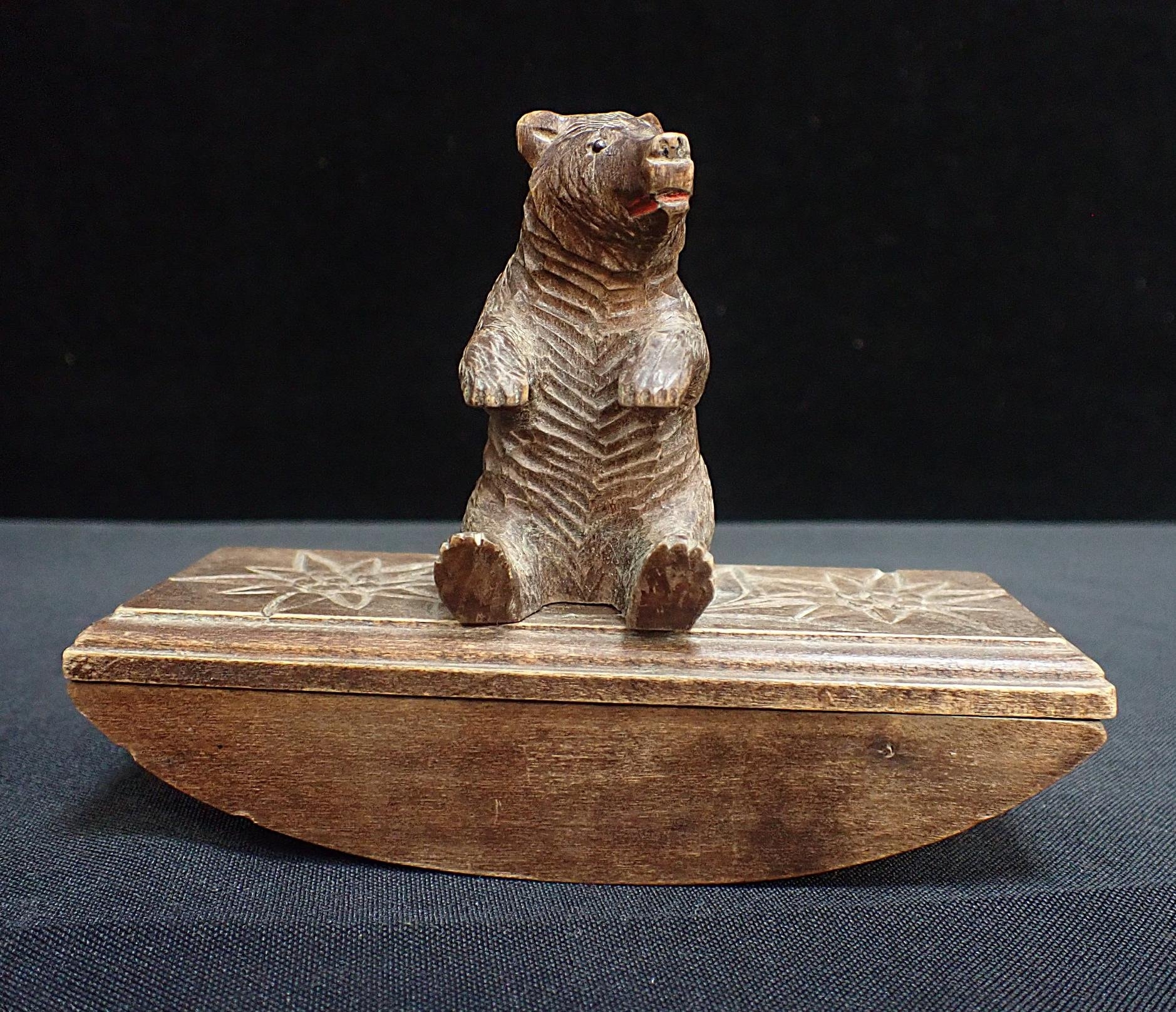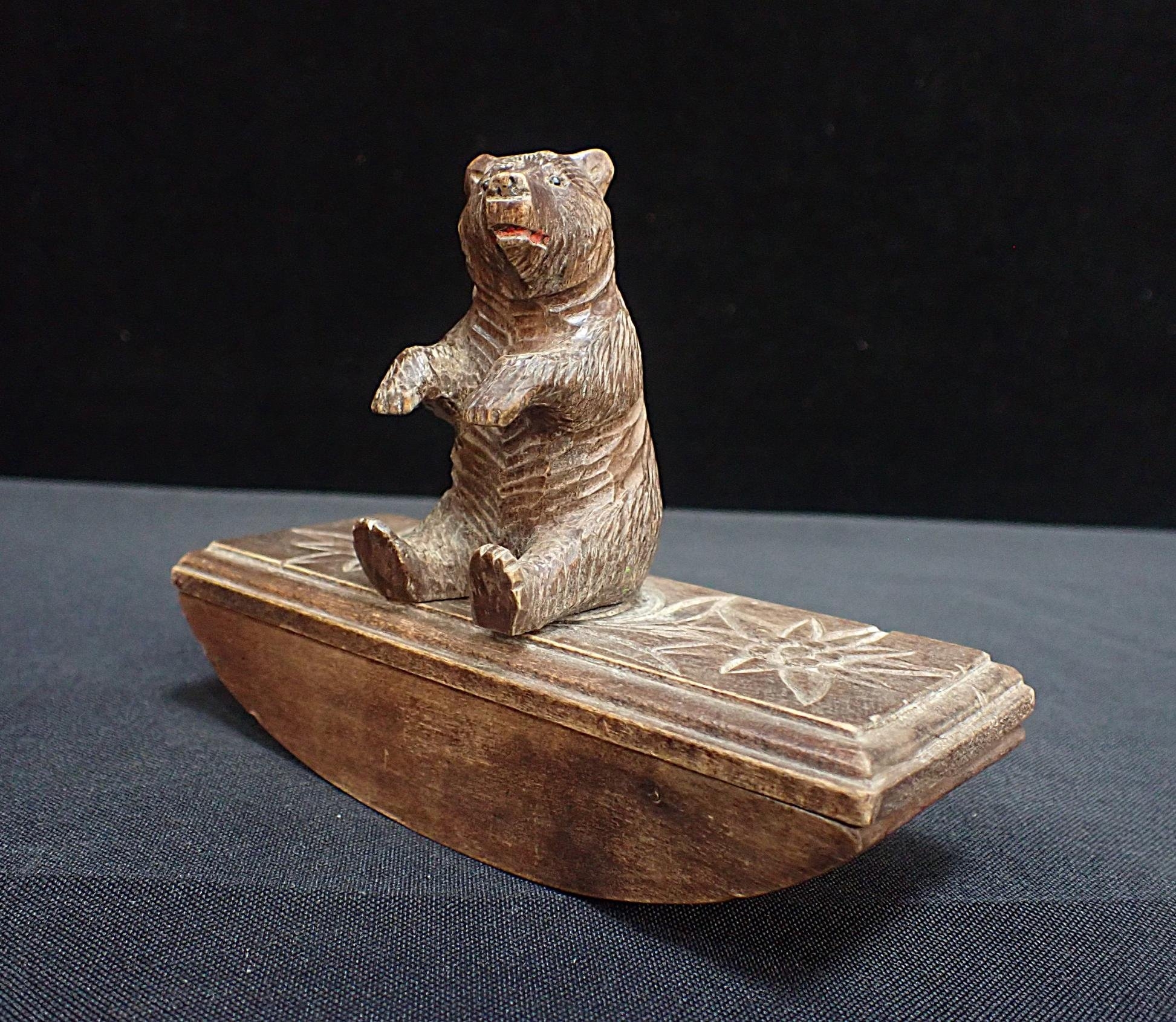 figured with a carved wooden seated bear atop, 10cm high x 13cm long (some nicotine deposit)