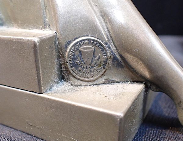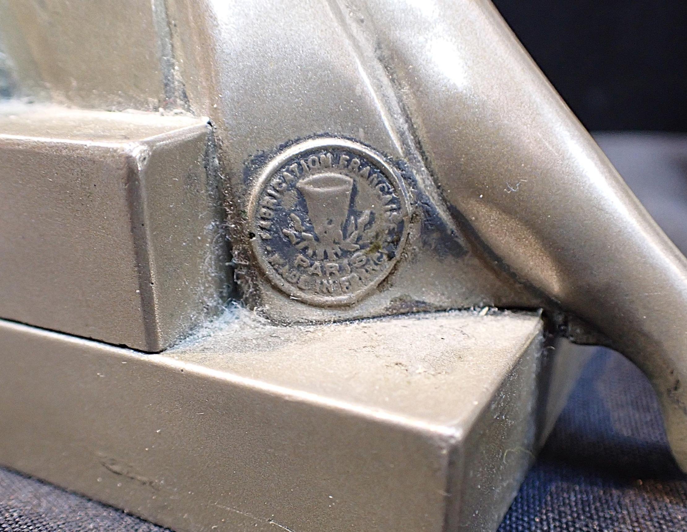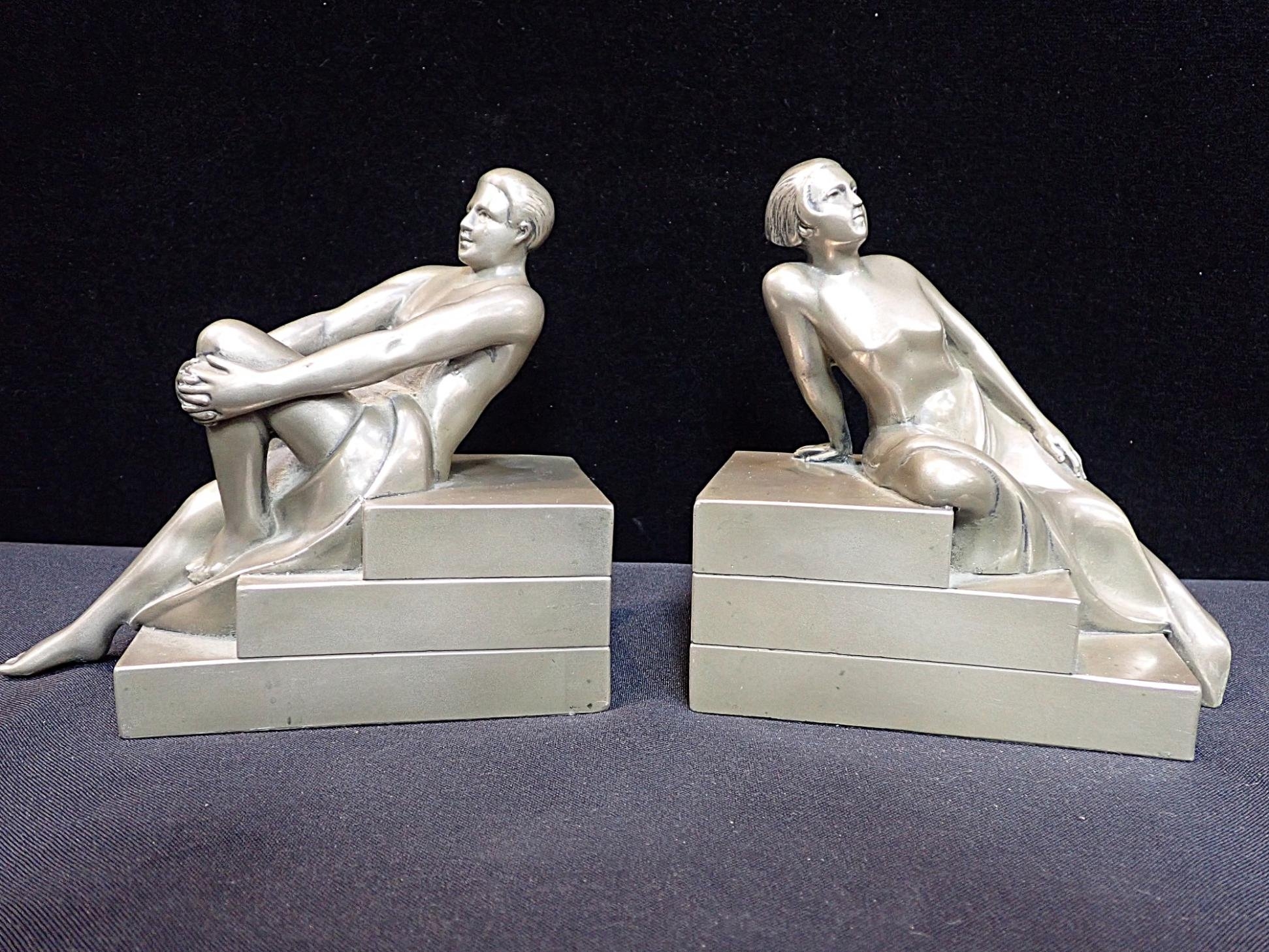 the male and female figures reclining on stepped bases, with nickel finish, 14.5cm high