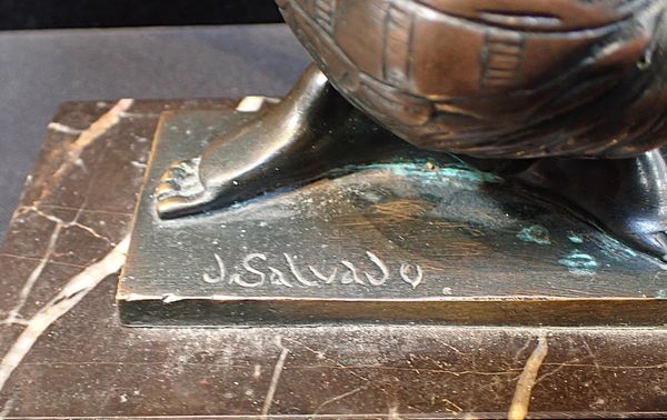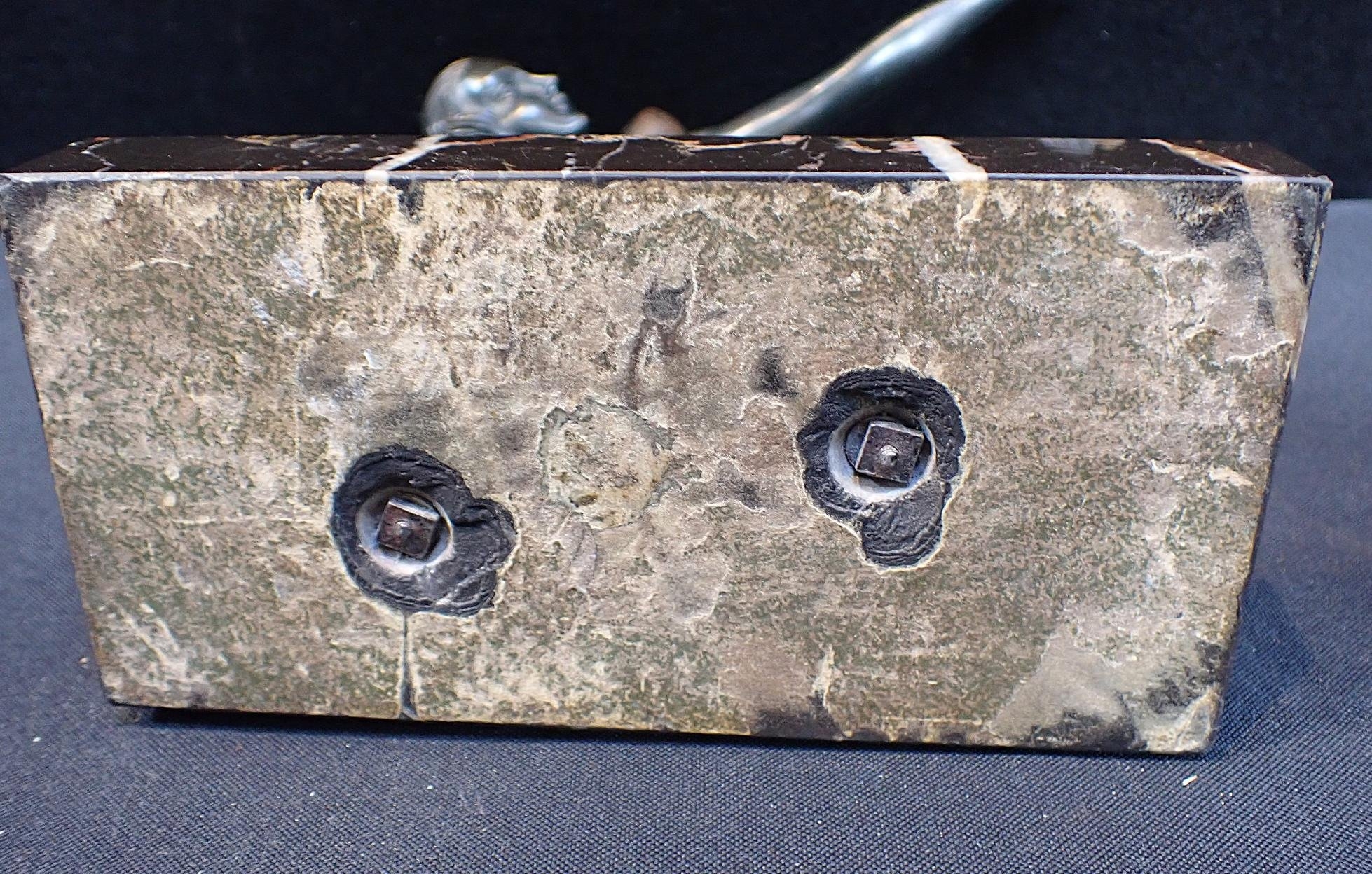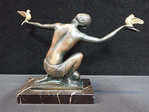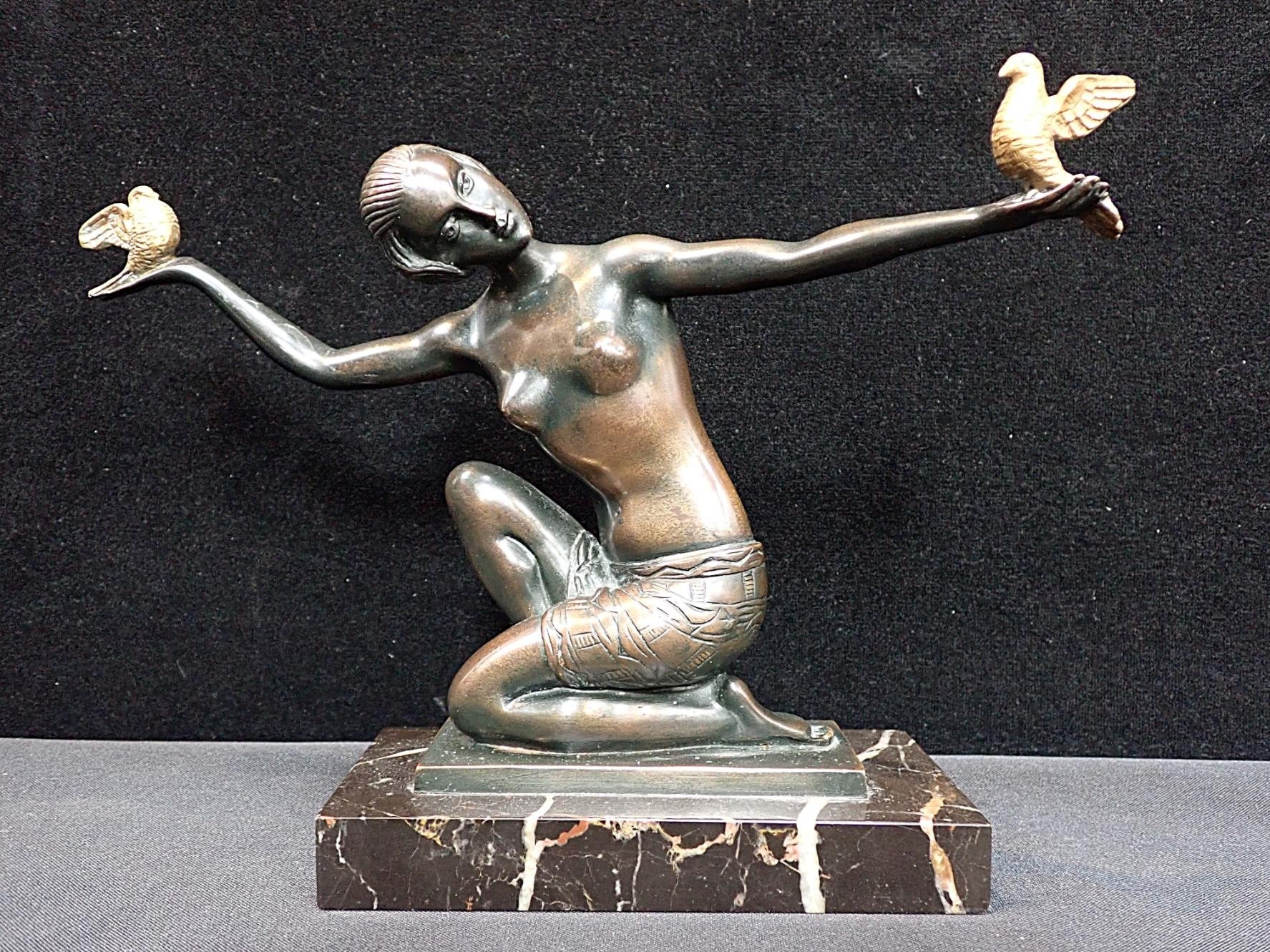 of a kneeling female with outstretched arms holding a dove in each hand, signed, on marble base, 19cm high, 19cm wide