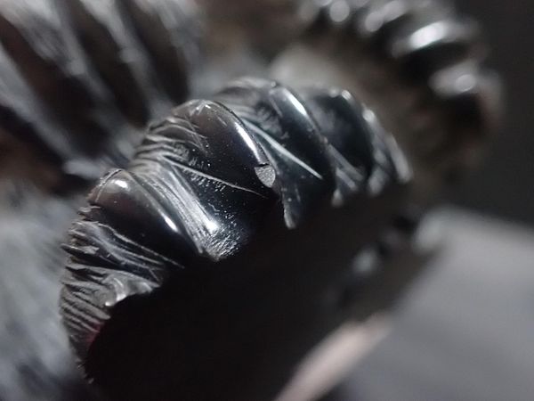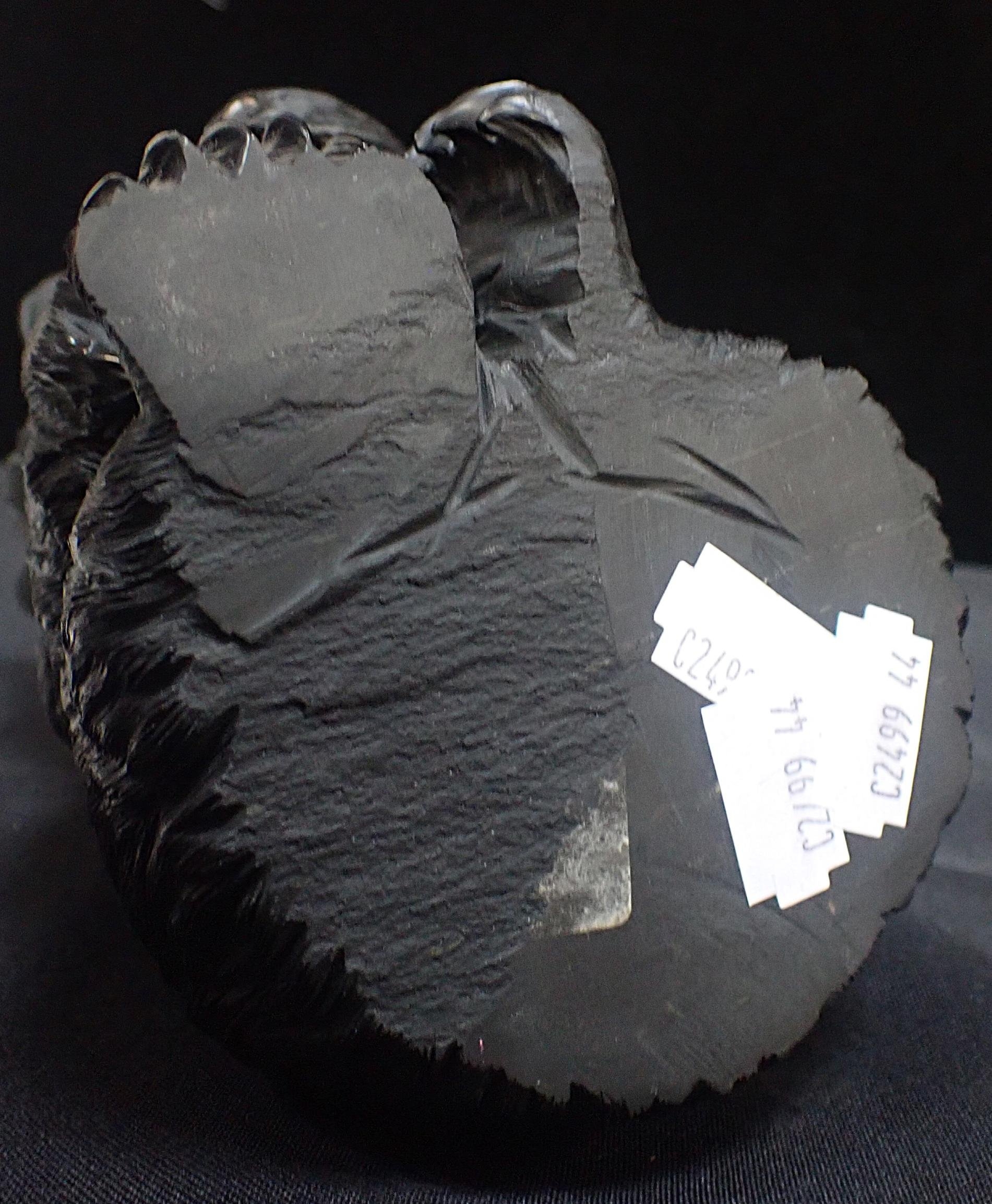 possibly obsidian, with red glass eyes, 16cm high (some nicotine deposit)