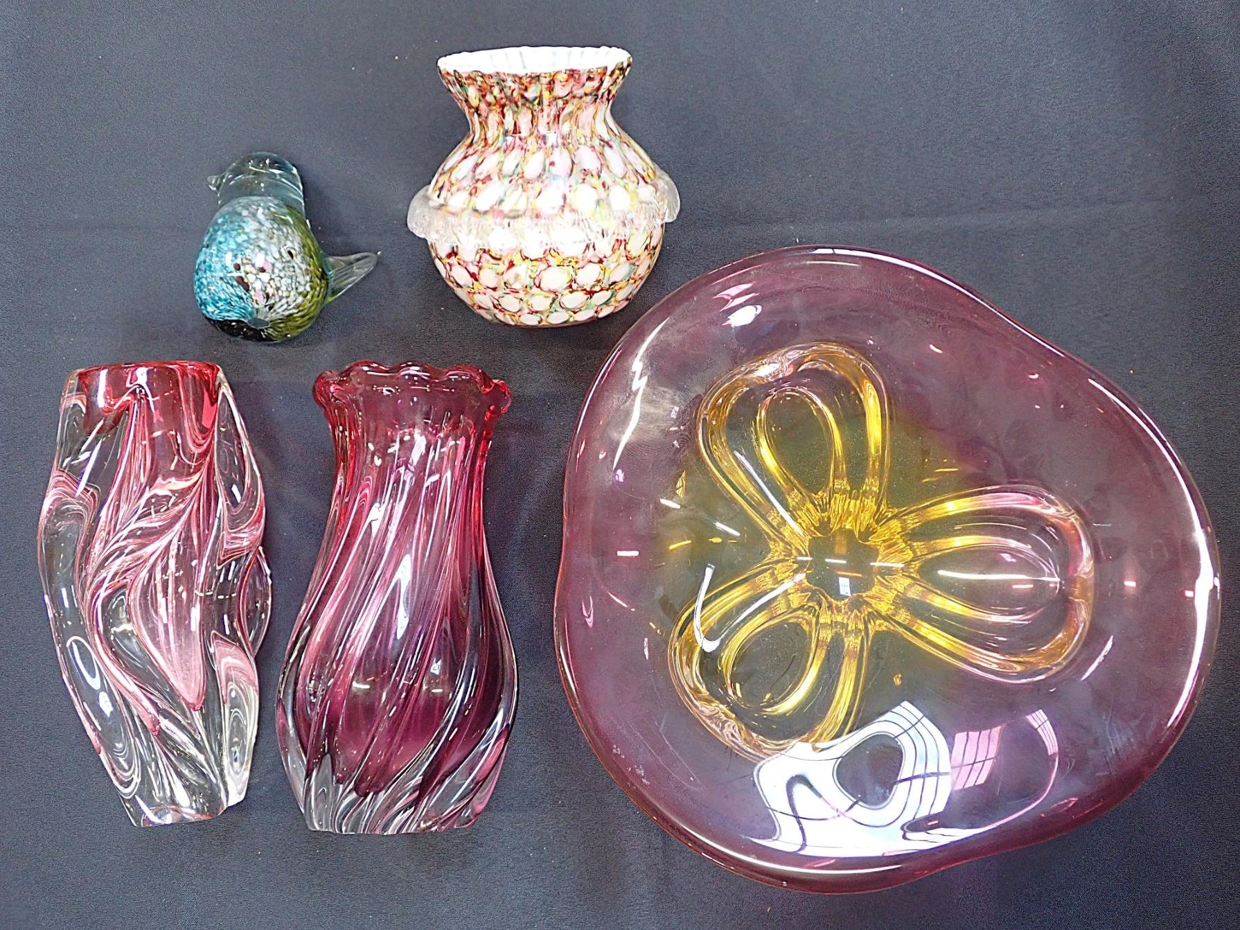 31cm wide, (small chip to foot), two similar vases, a Mdina bird, and an end-of-day type vase (5)