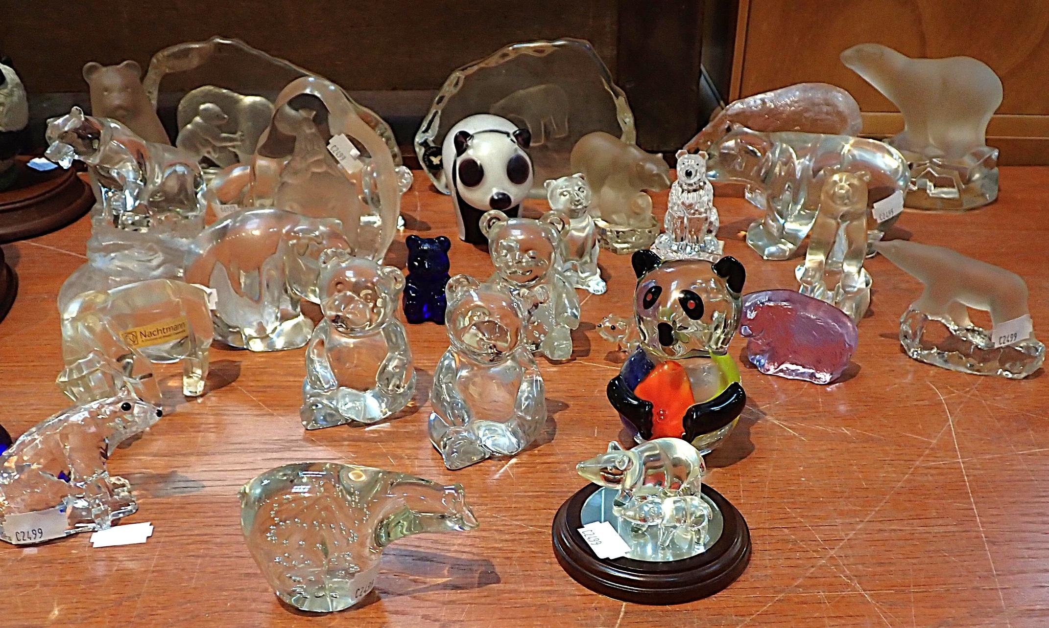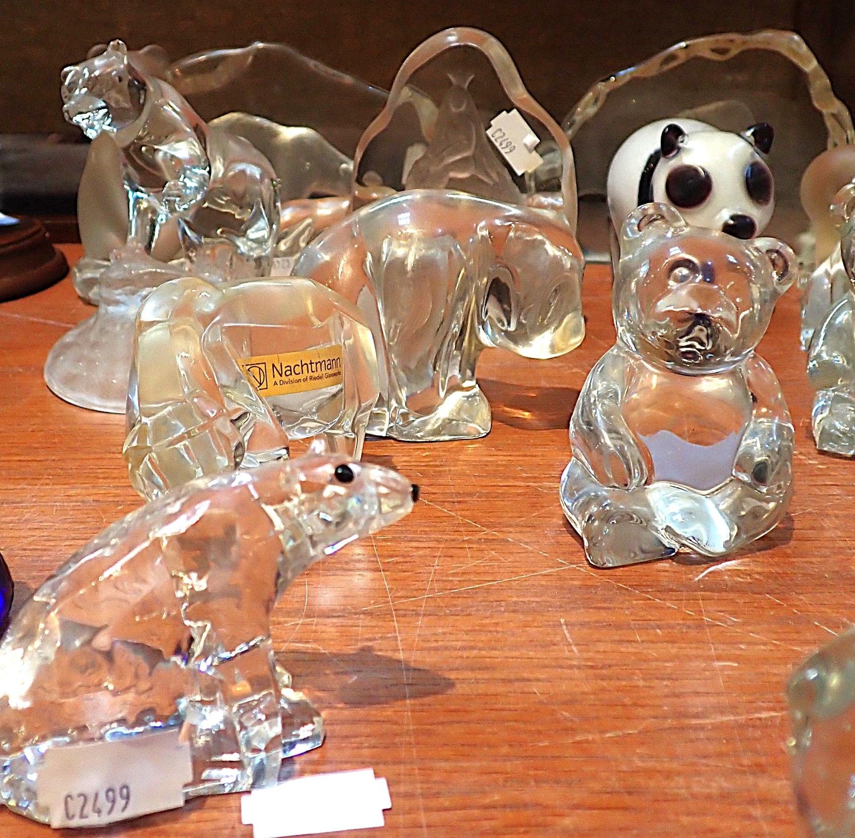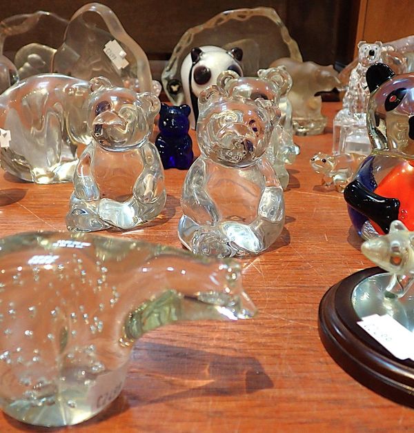 comprising models by Pukeburg, Nachtmann, a Wedgwood panda, a Waterford bear, Sean Egan, and various other examples, the largest 12cm high (some nicotine deposit)