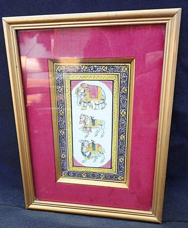 depicting an elephant, horse, and camel, within a floral border, framed, 28 x 20.5cm