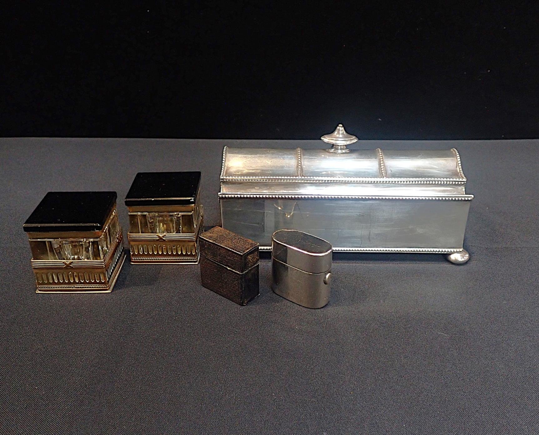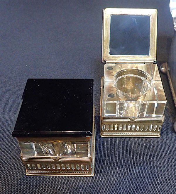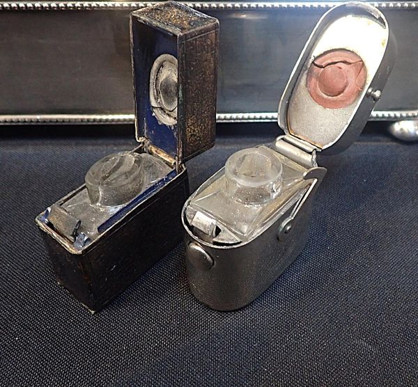 with serpentine profile hinged lid enclosing two inkwells and covered central compartment, on bun feet, 20cm wide, with a pair of German brass-mounted inkwells with black glass lids, and two travelling inkwells (5)