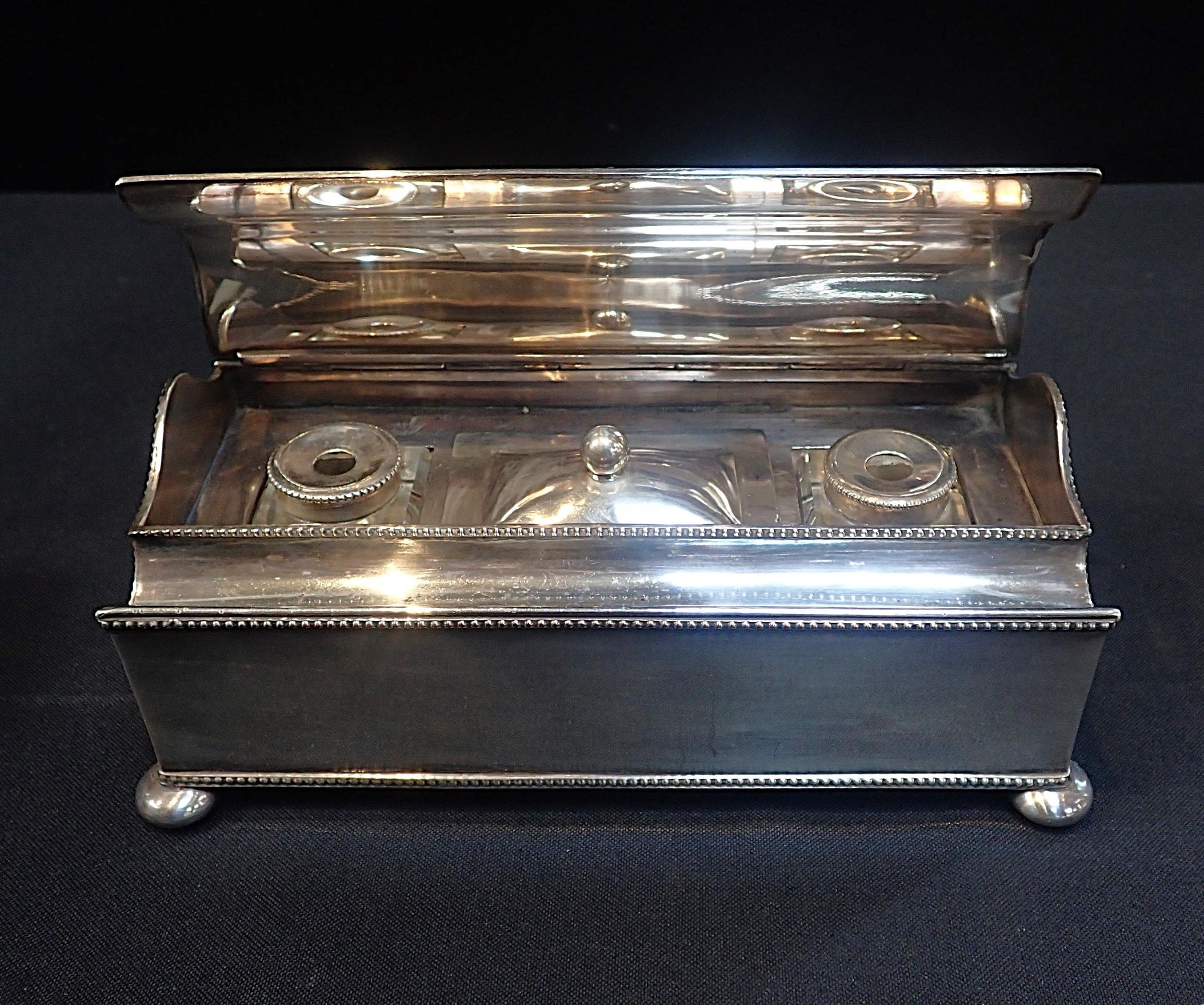 A SILVER-PLATED ON COPPER DESK INKSTAND