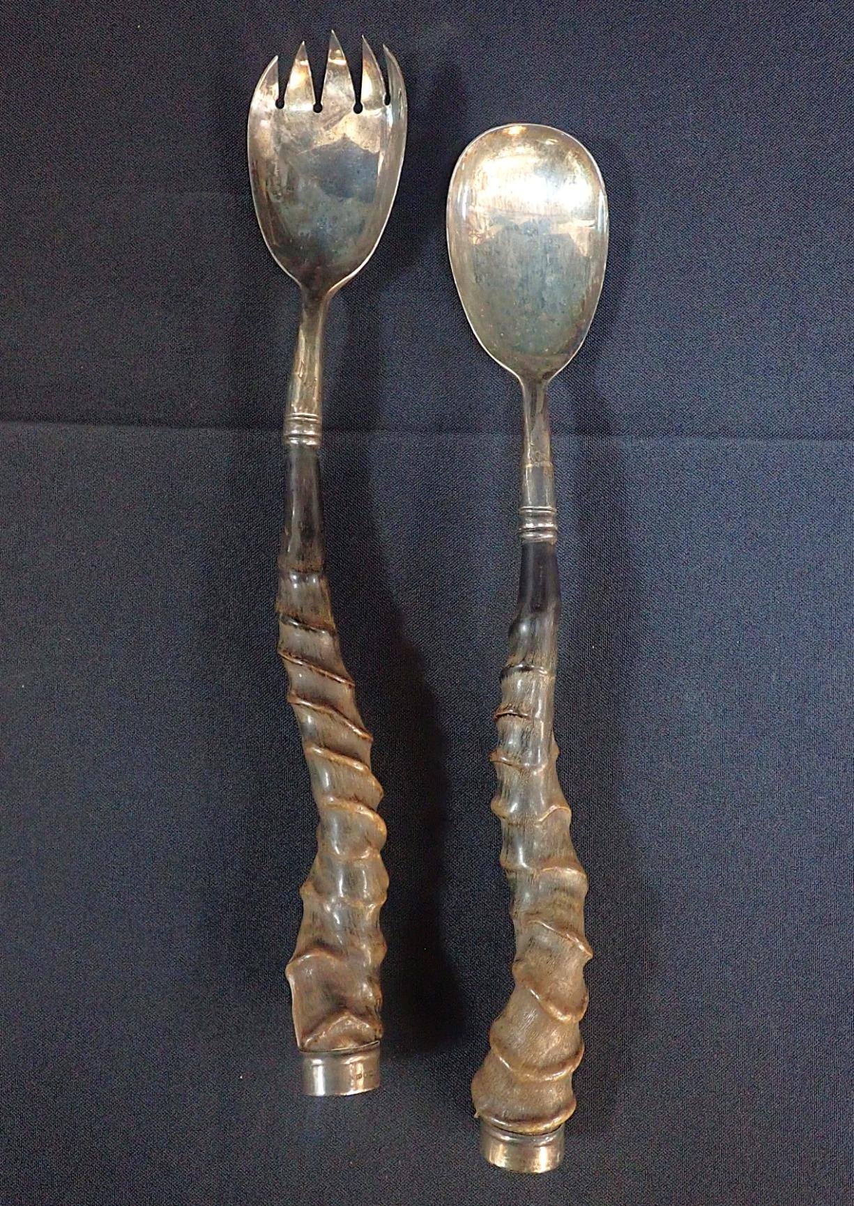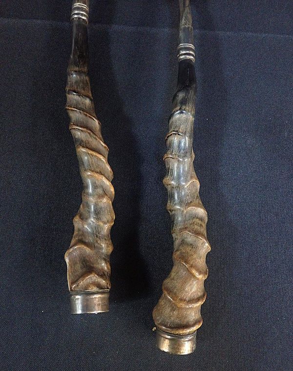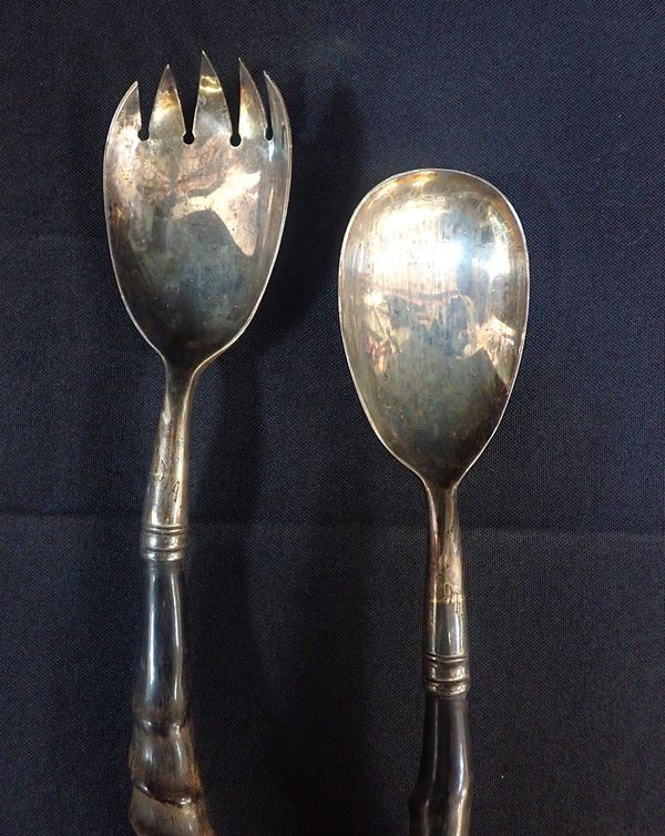 A PAIR OF GEORGE V SILVER AND HORN SALAD SERVERS
