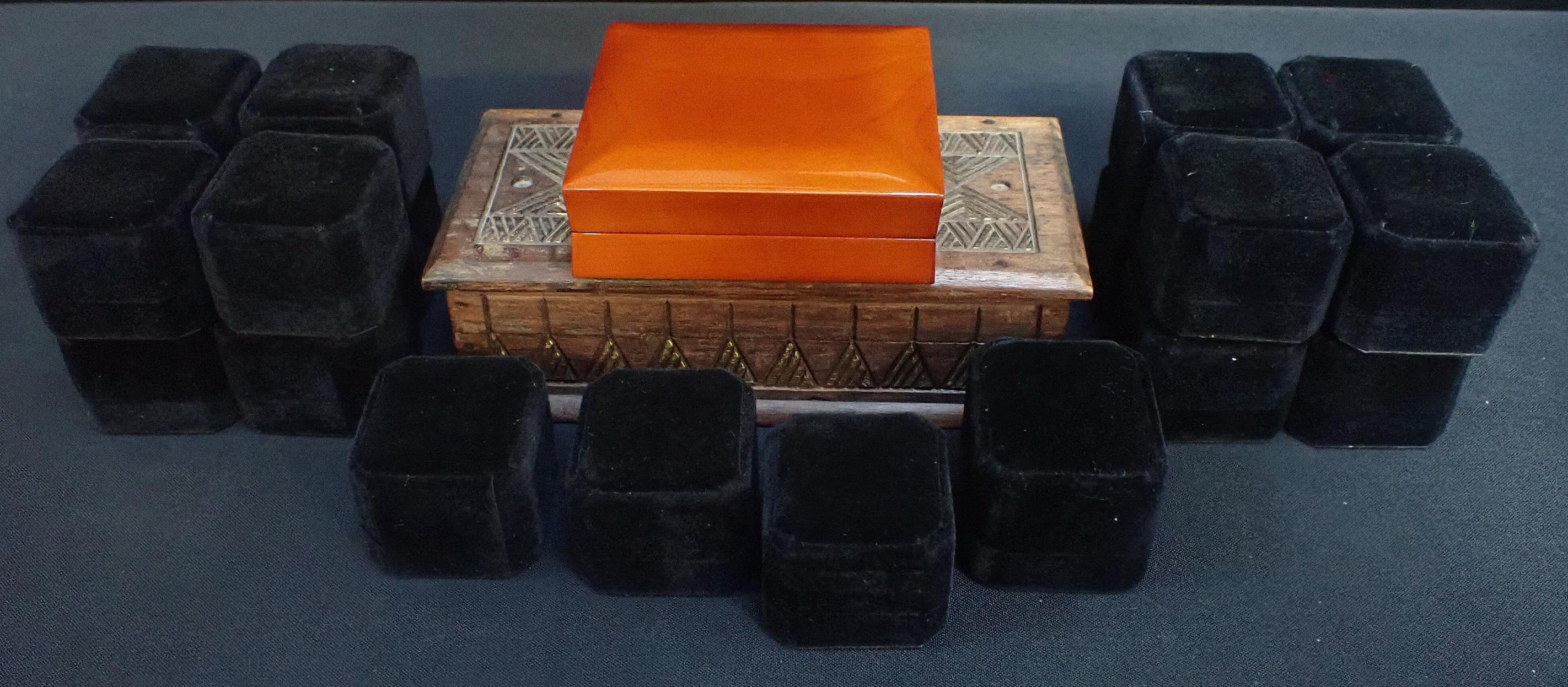 Including: twenty black velvet ring boxes, one wooden necklace box and a wooden jewellery box. (22)