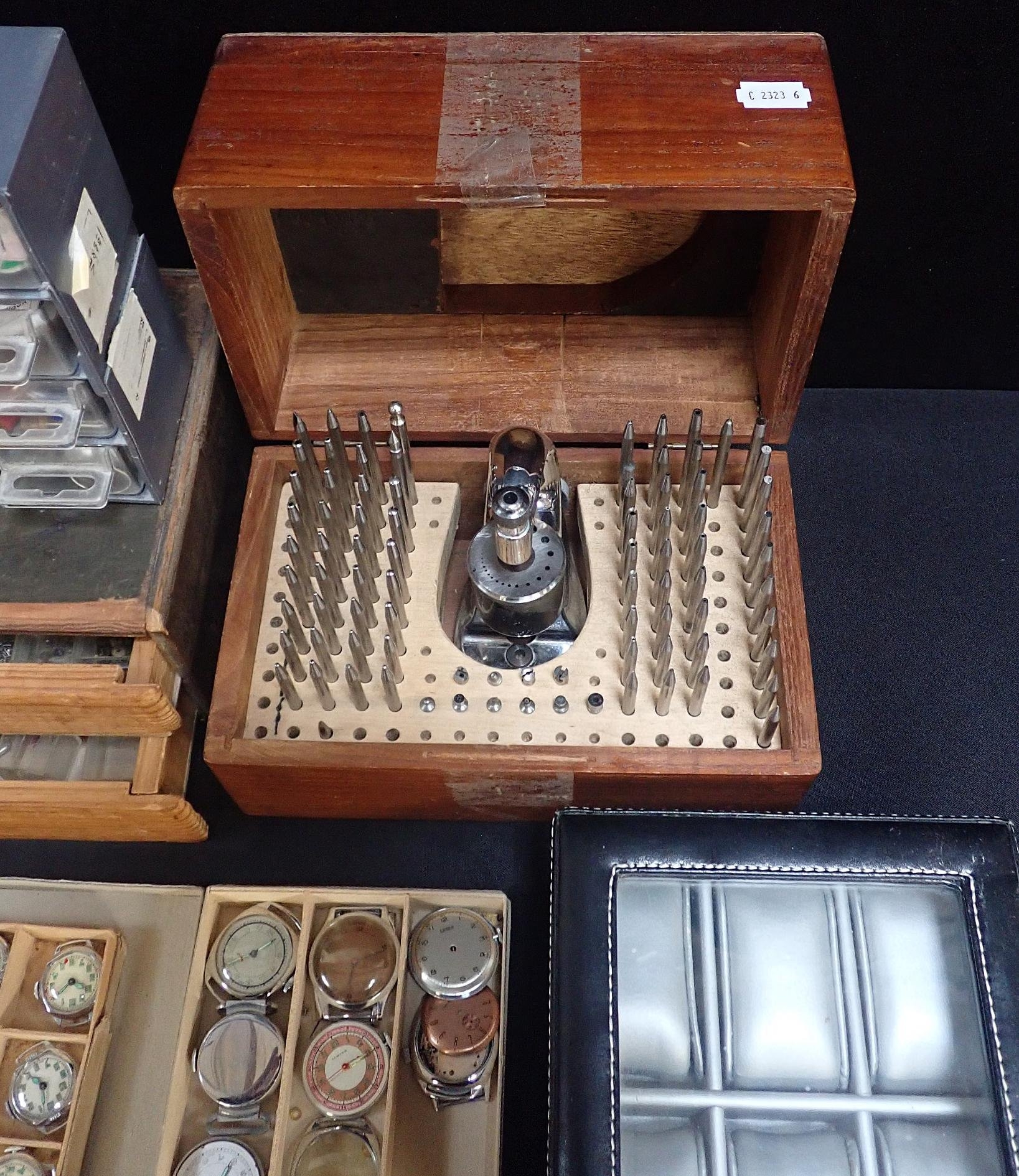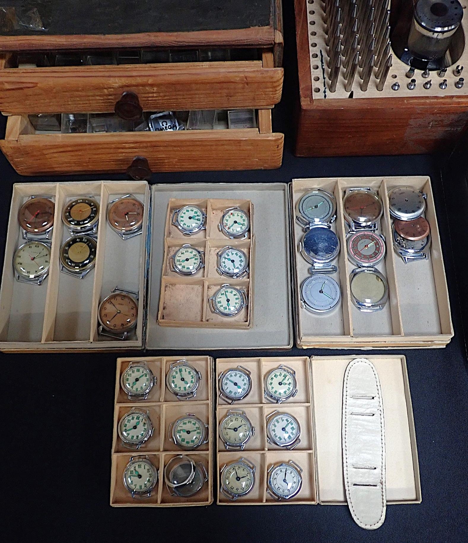 comprised of ladies and gents and various watch arts; together with various crowns, stems, springs, glasses, and watch tools; and a watch display case