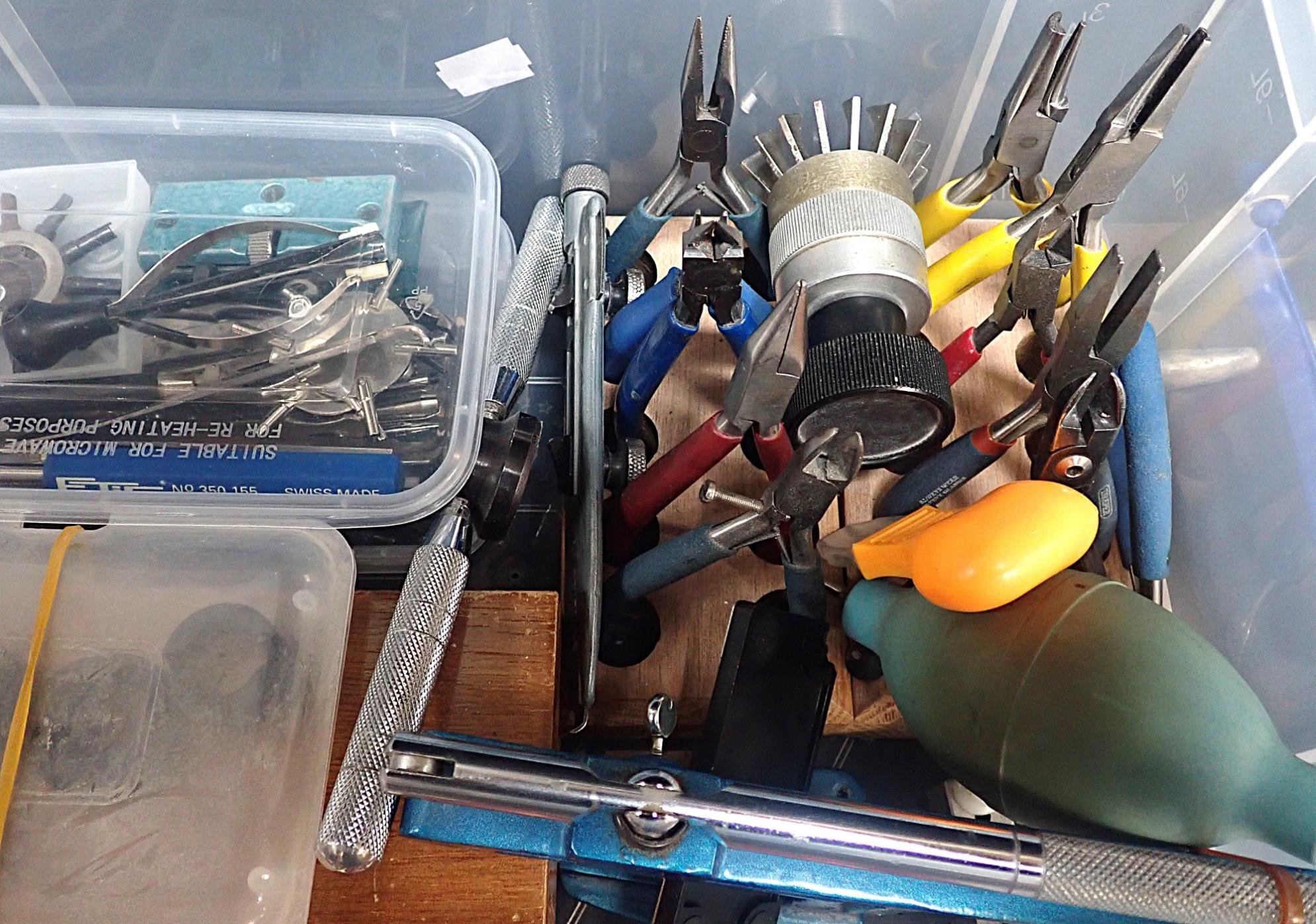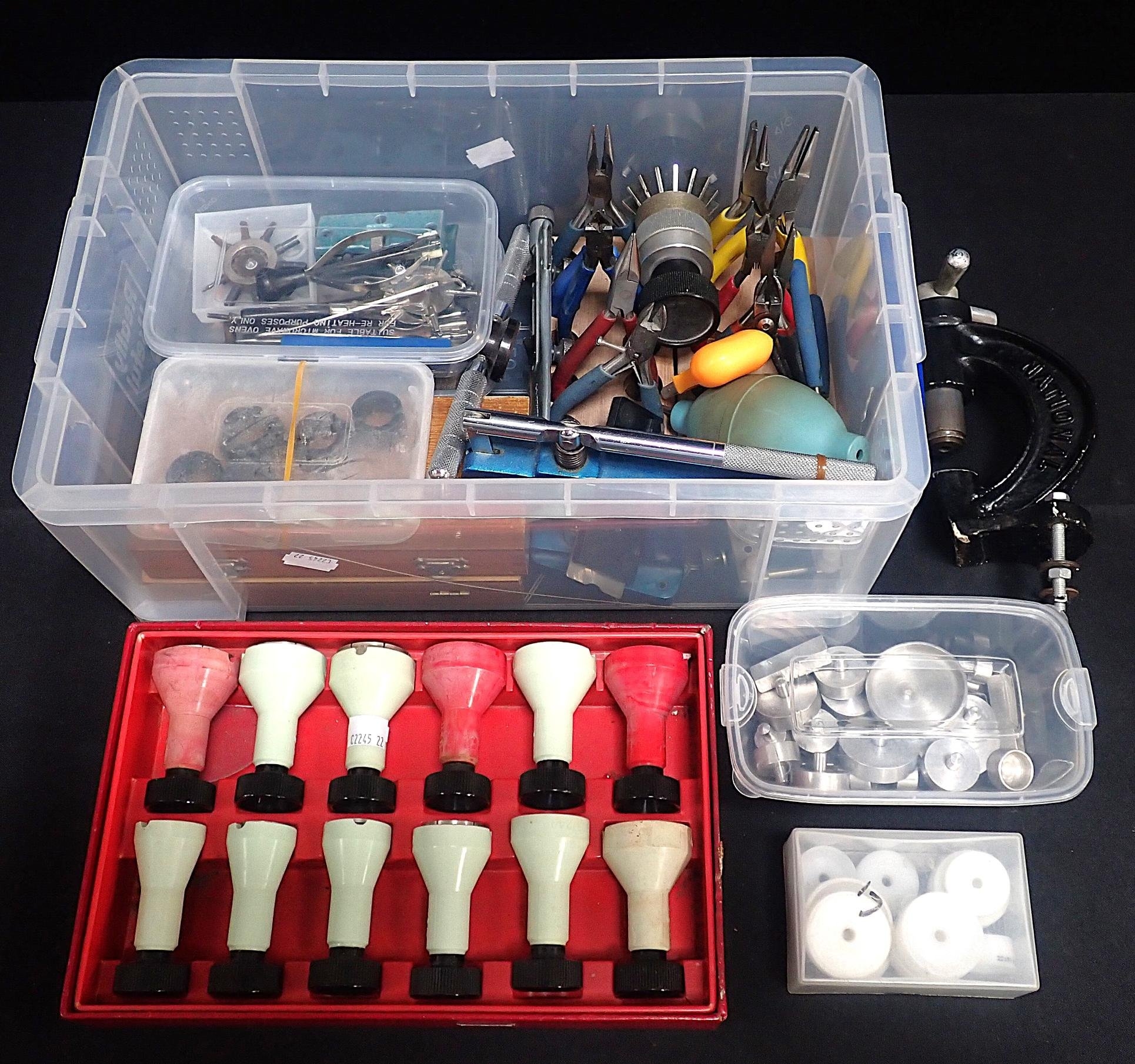 and various other watch tools, with a Tissot watch case back opener set and a quantity of various balance wheels