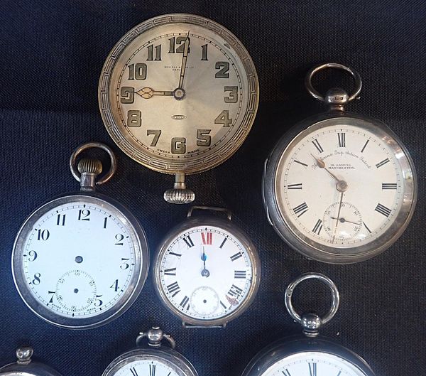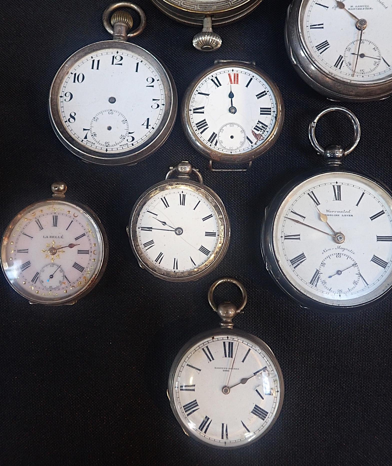 'The Climax Trip Action Patent' with key wind movement, white enamel dial, black roman numerals, subsidiary seconds dial, gold hands, case diameter approx. 50mm; together with various other pocket watches, a gun metal trench watch, and a bedside clock, lacking frame (8) (all a/f)