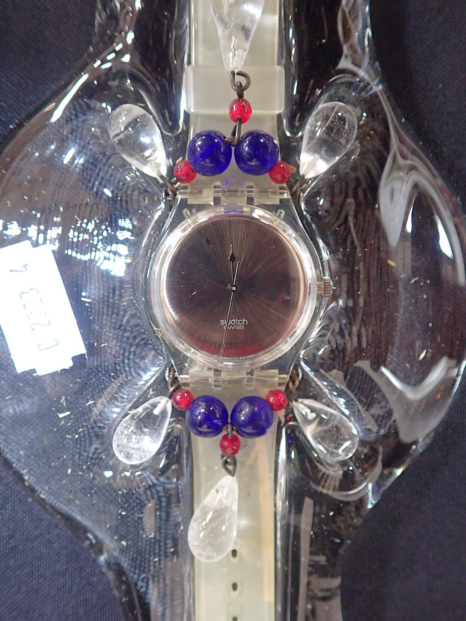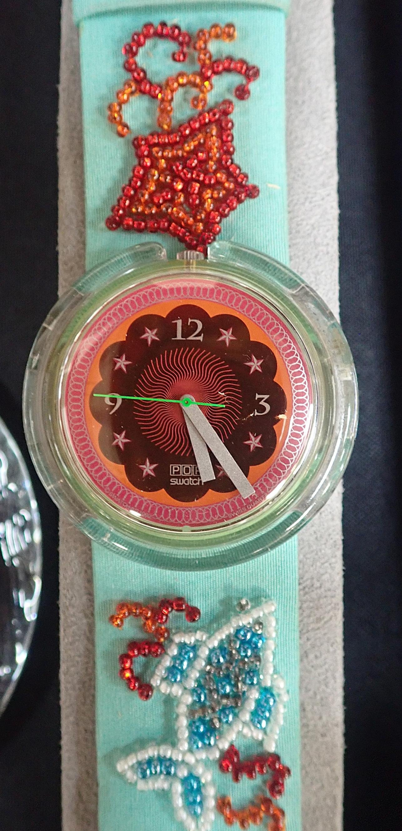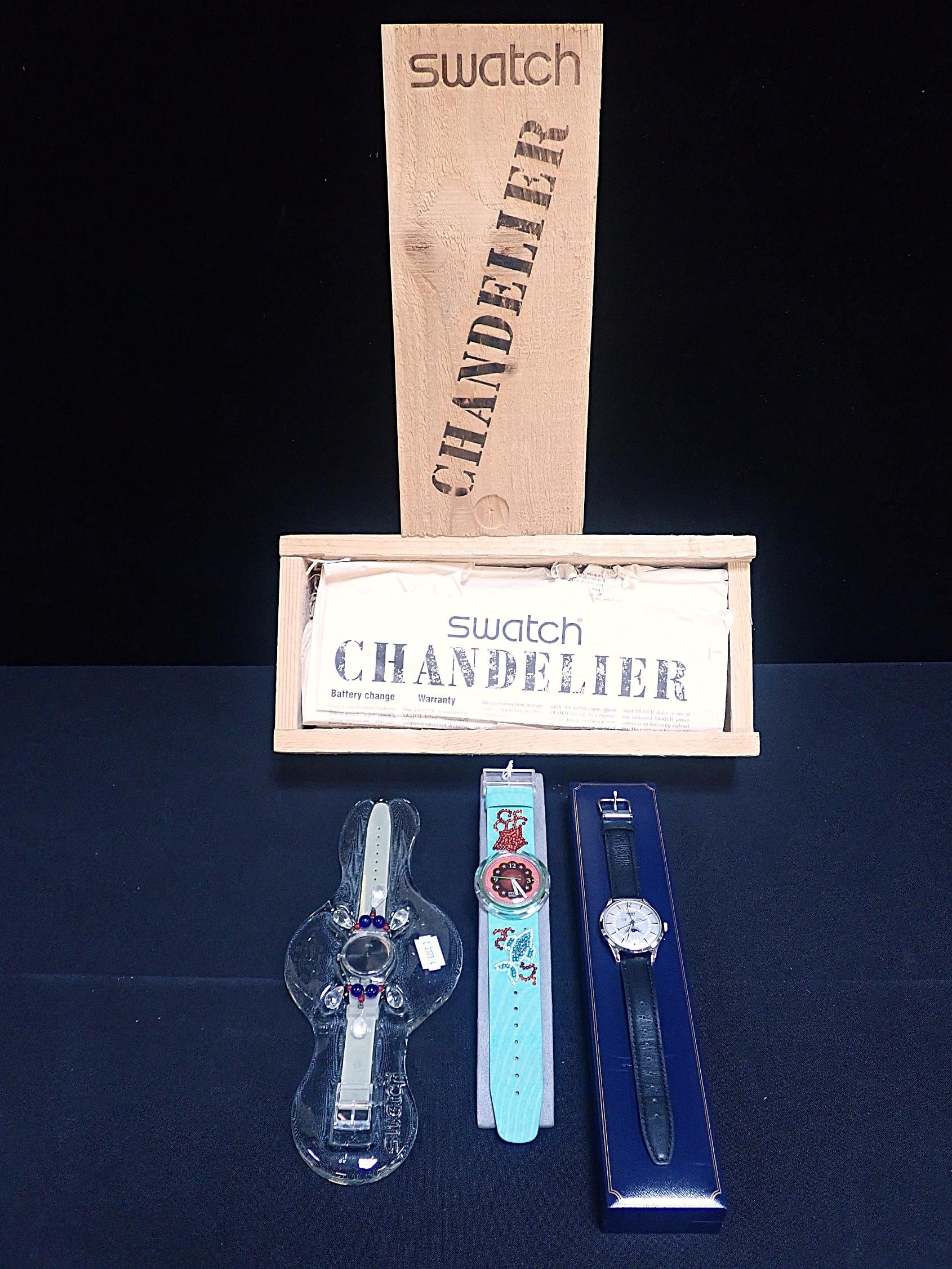 in original watch box with quartz and numerant silver dial, neon face, on a dark blue leather strap; together with two various SWATCHES in a SWATCH wooden box (3)
