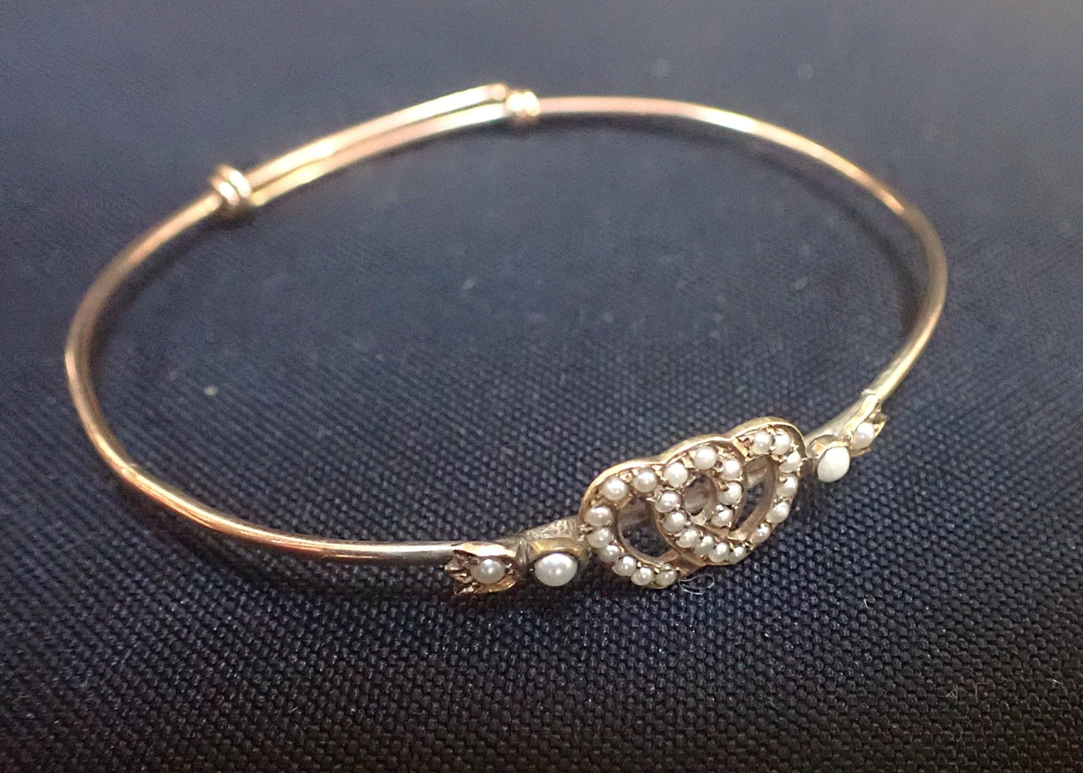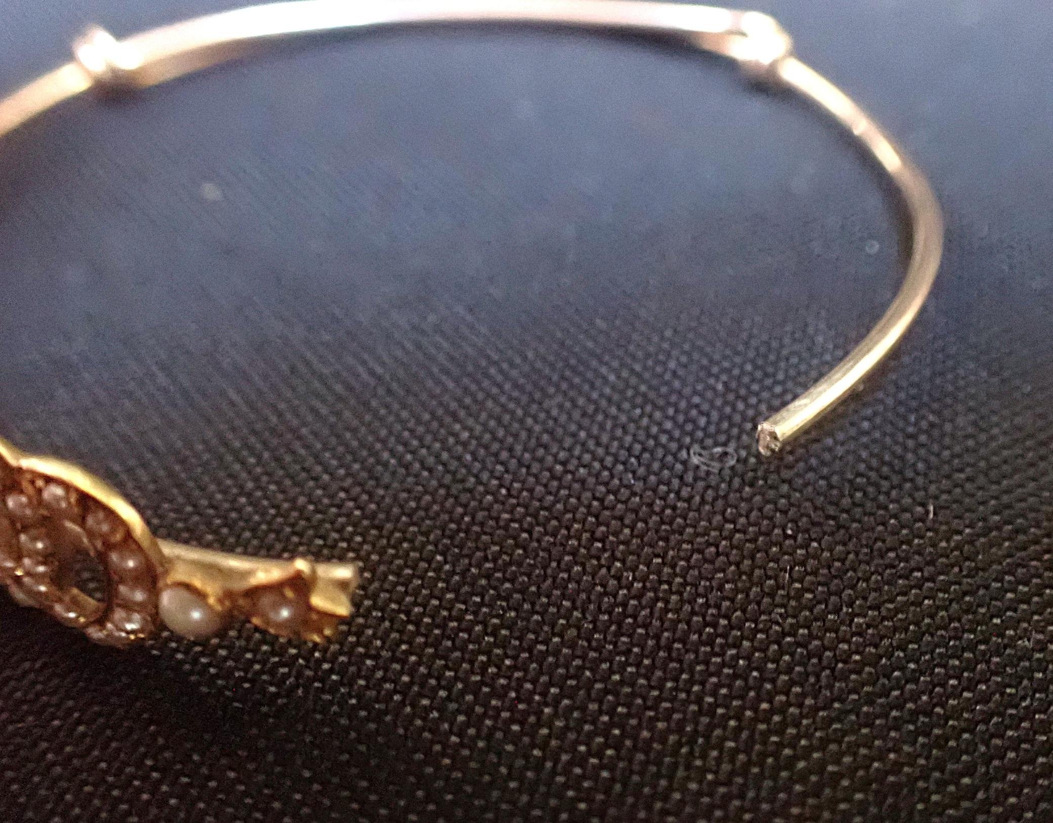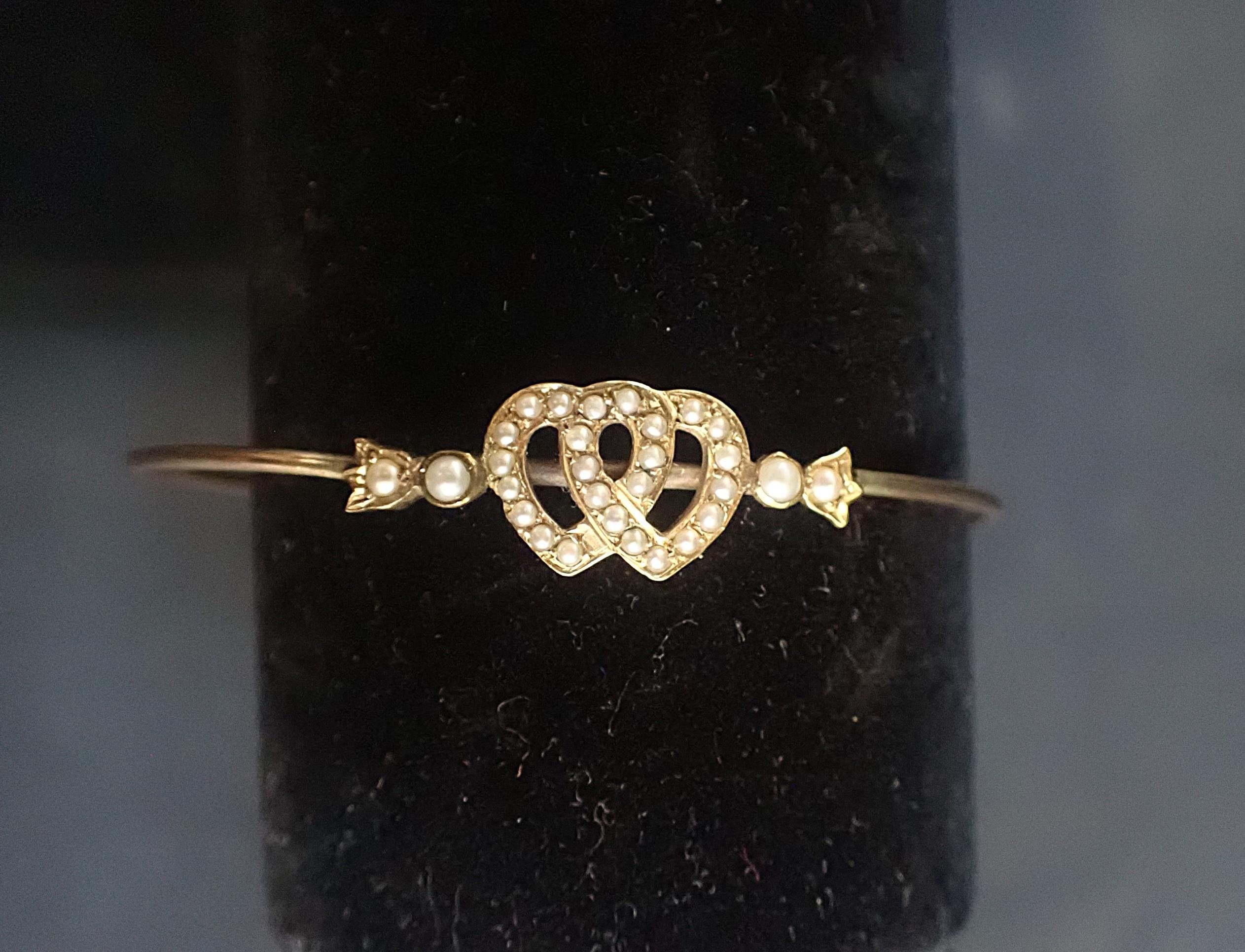 decorated with two seed pearl hearts, (broken), tests as gold (c.5.8grams) total weight