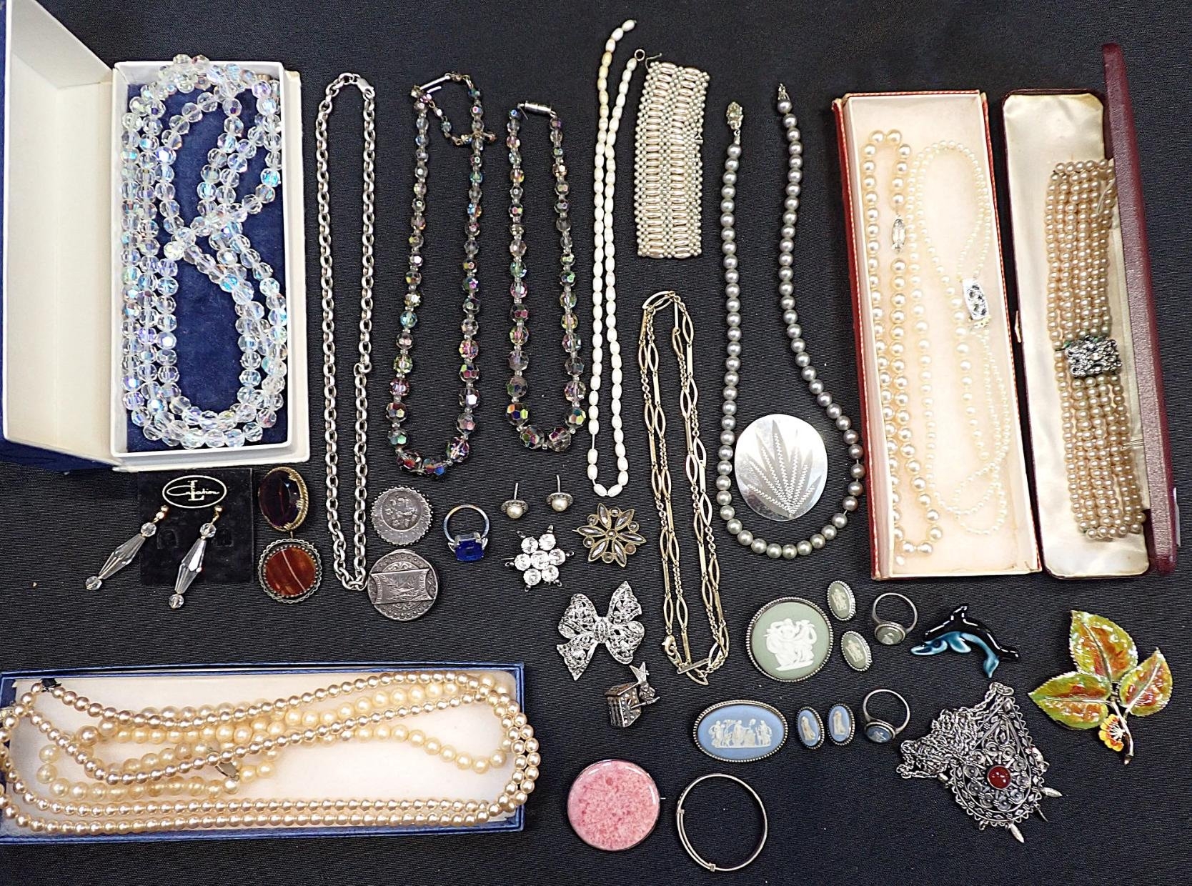 including a silver brooch, Wedgwood jasper items, bohemian glass necklaces, faux pearls, a Ruskin brooch (damaged), and other items