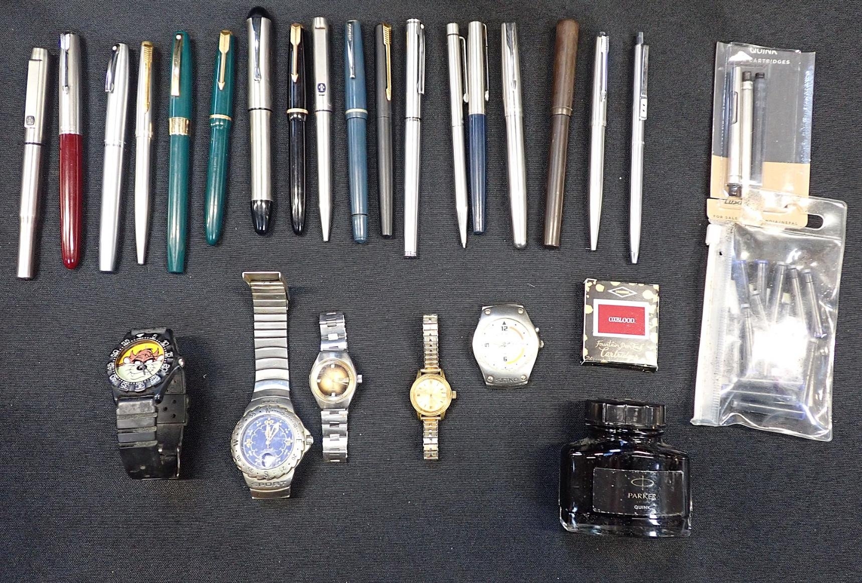 mostly Sheaffer and Parker (14ct gold nib), and a 'John Bull' pen, with a few modern wrist watches