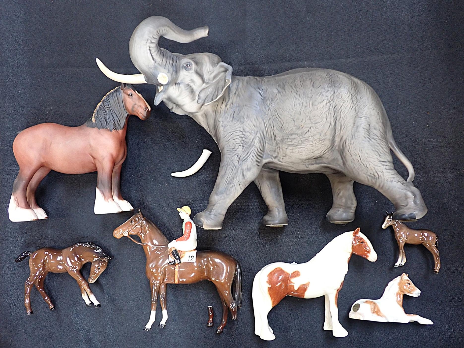 30cm high (tusk broken), and various Beswick horses, one with Jockey up, No.12 (leg broken) (7)