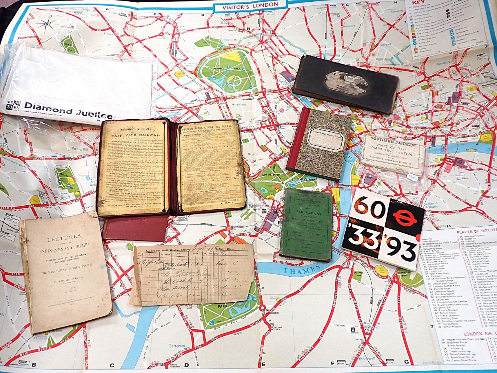 including a London Transport 1976 'Visitor's London' map, an unused L and S.W.R number taker's book with marbled covers, and other items