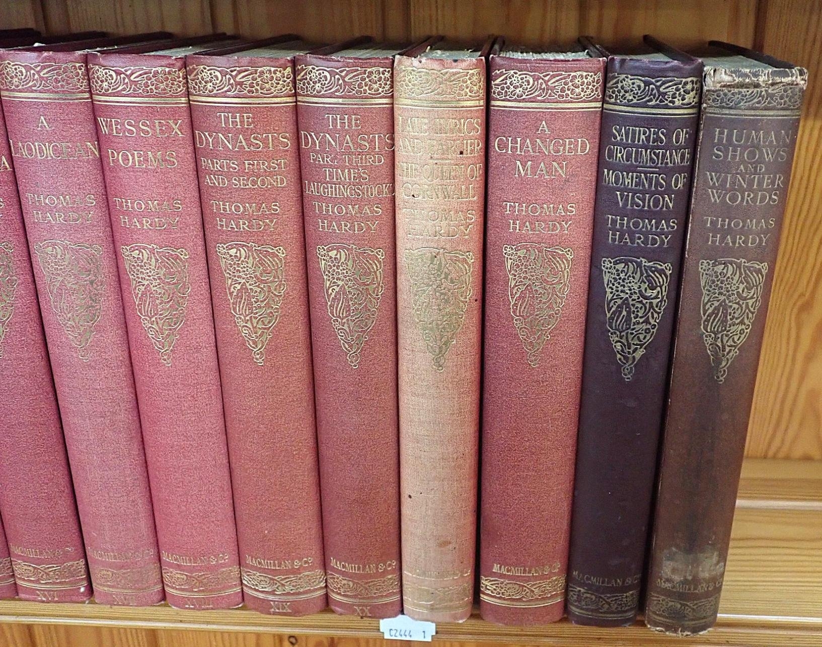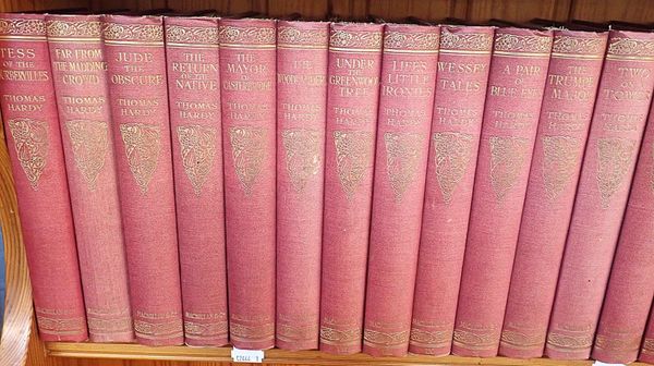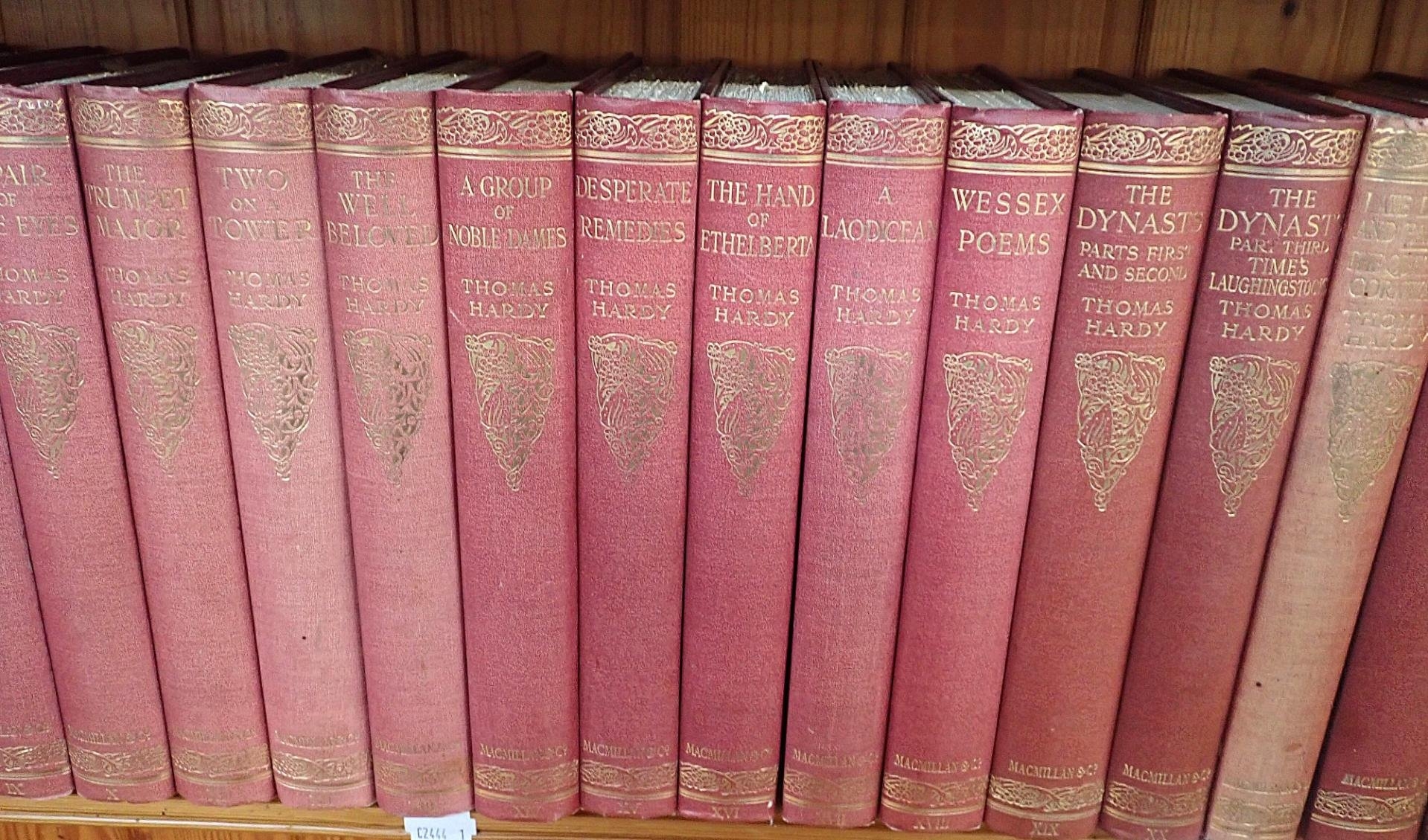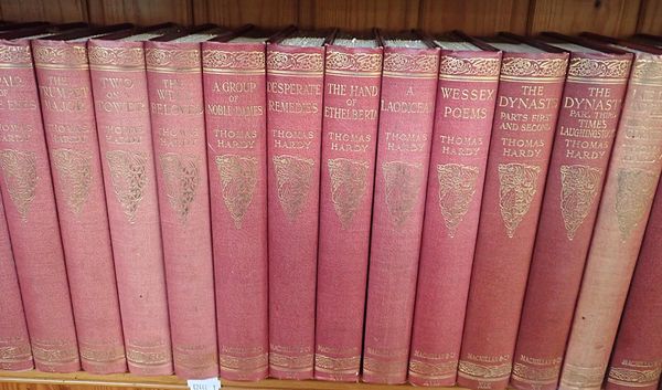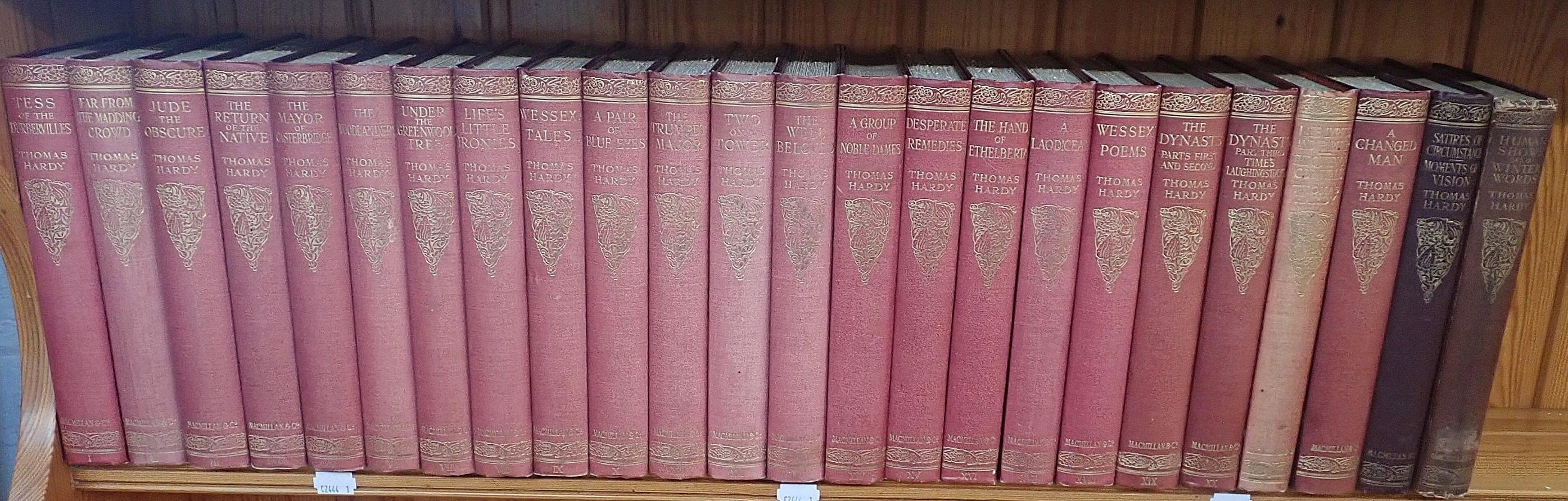 24 volumes, all first editions, with the first 20 numbered base of spine I - XX; final three scarce poetry volumes added subsequently, Human Shows and Winter Words a library copy; first 21 volumes inherited by Dr Mann, the Hardy family G.P., bequeathed by Kate Hardy, 1940, these volumes likely from Hardy himself, allowed to him by the publisher, hence the 'With the Author's compliments' slips in some volumes (some fading, etc)