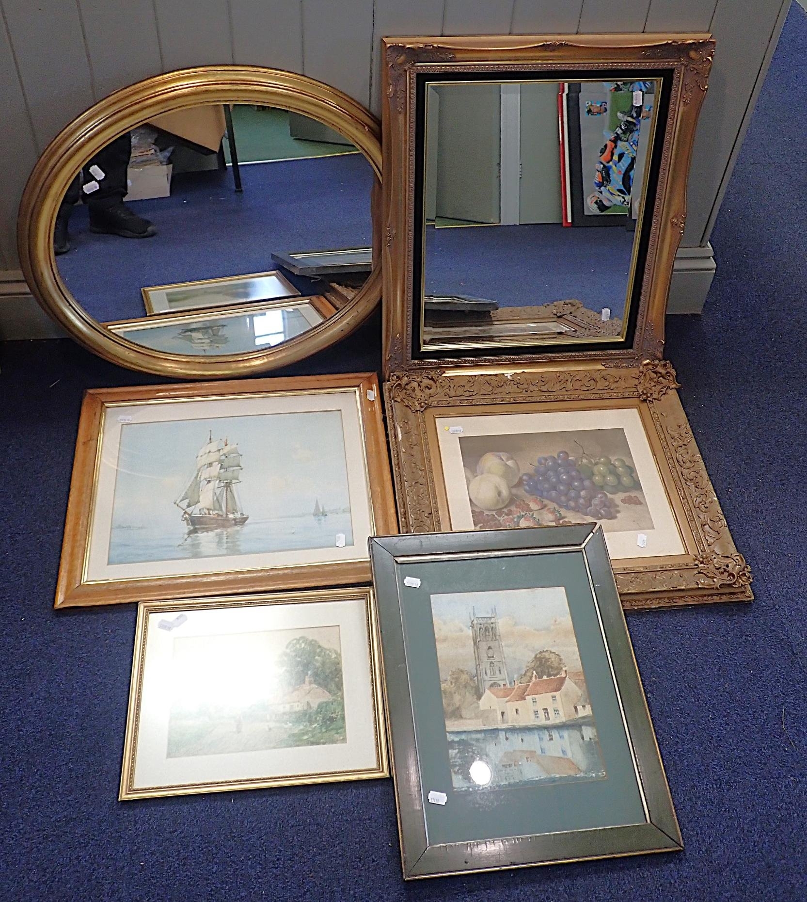 chromolithograph, in moulded gilt frame, 49 x 56cm (chips), a watercolour by Wellesley Cottrell; 'A Welsh Village', other pictures, and two modern gilt framed mirrors
