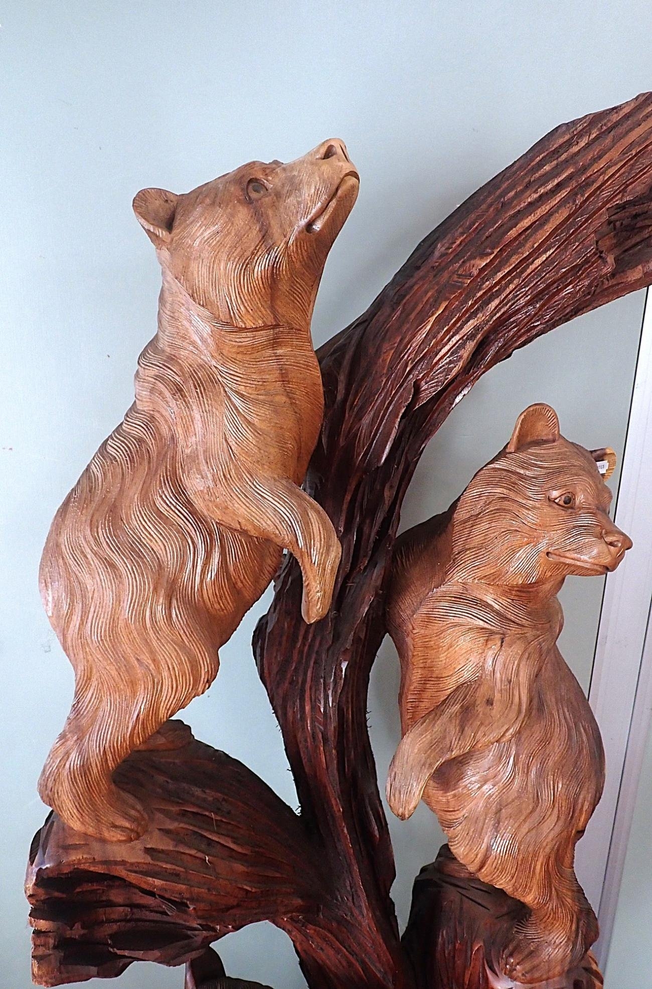 likely 20th century, a rampant bear to the base with two cubs climbing the carved trunk, 160cm high x 52cm wide x 30cm deep (some nicotine deposit)