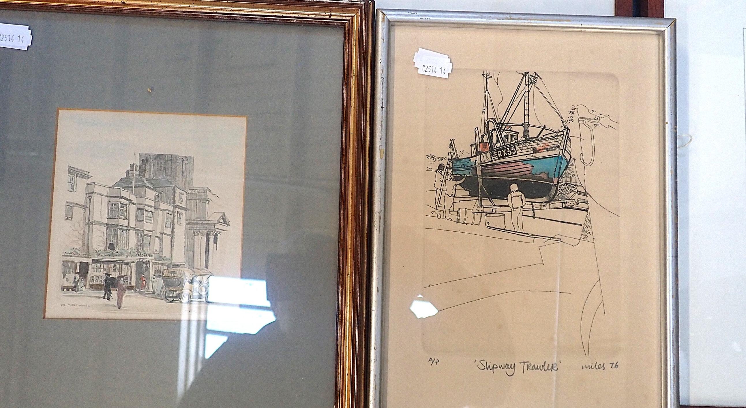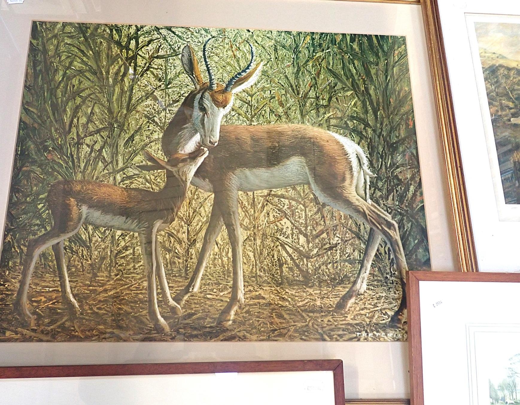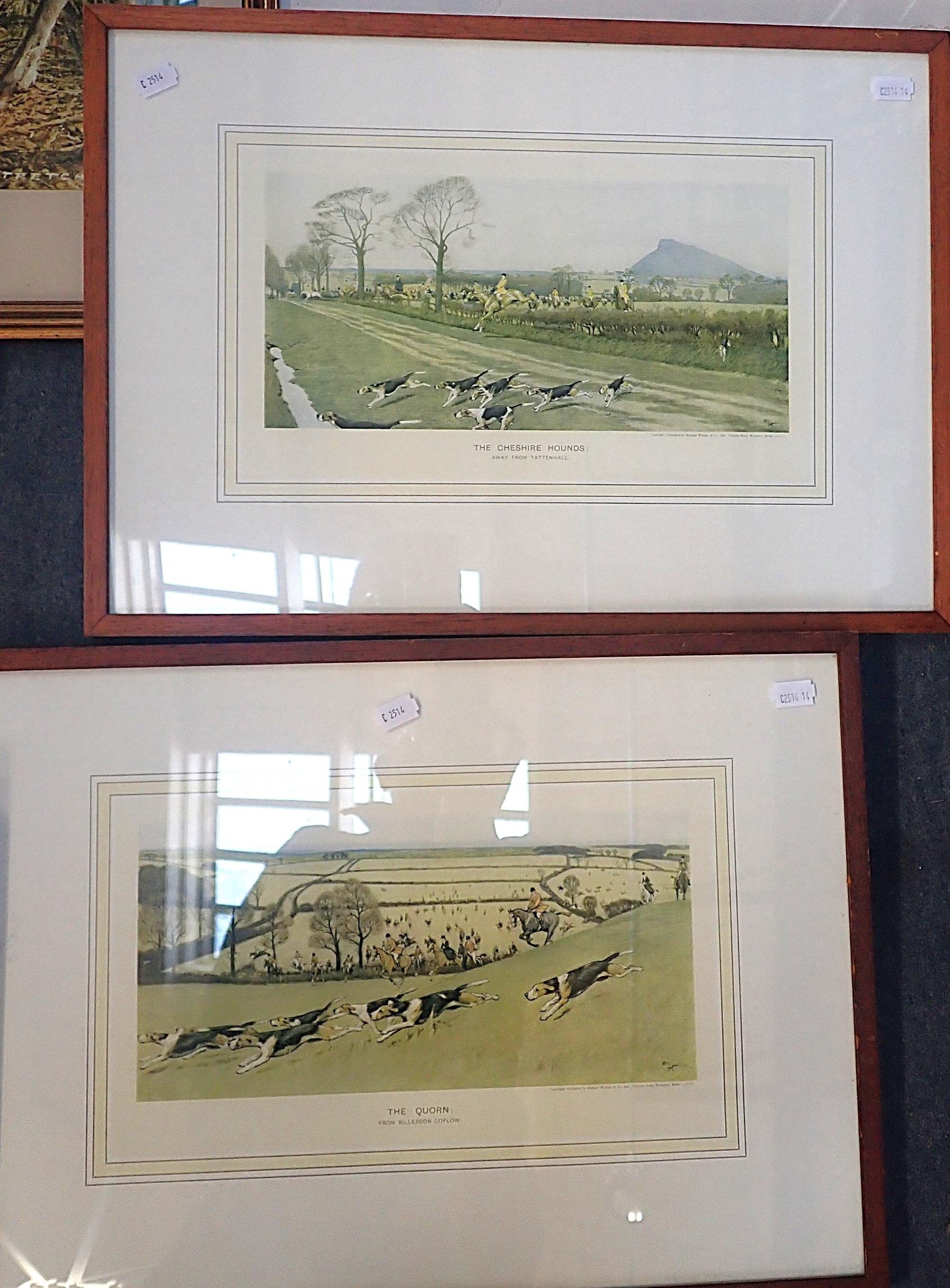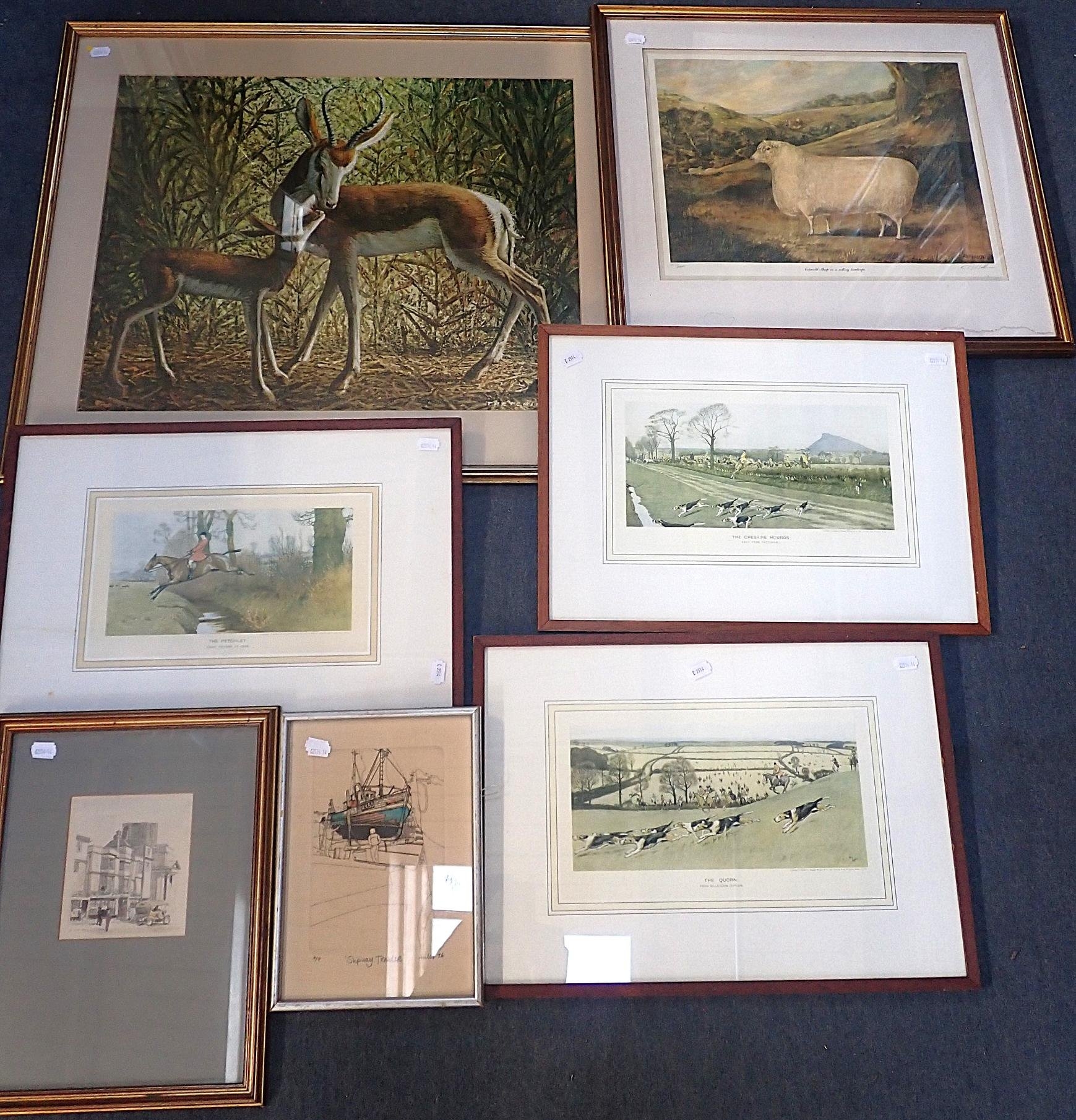 framed print, with three hunting prints, and three other prints (7)
