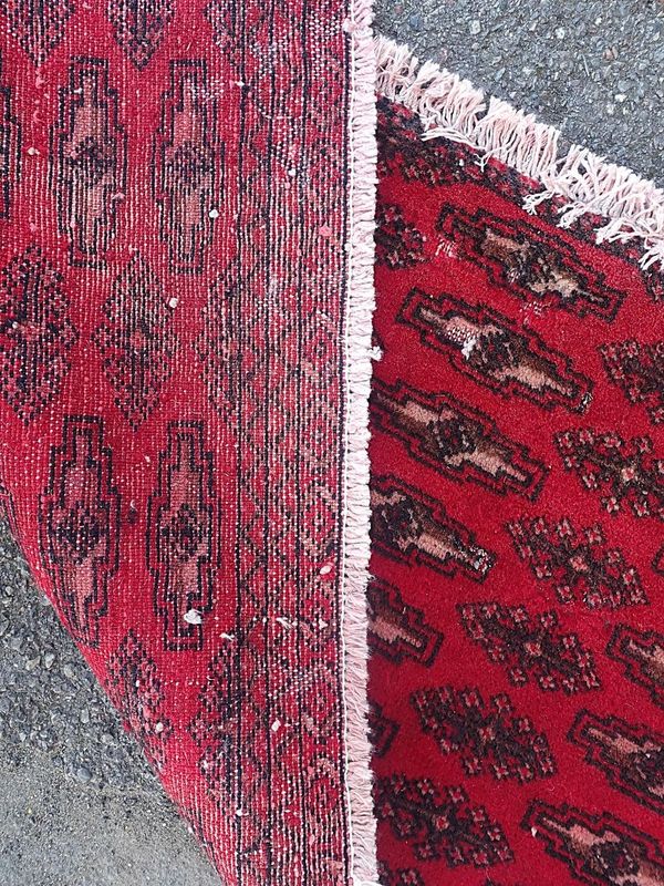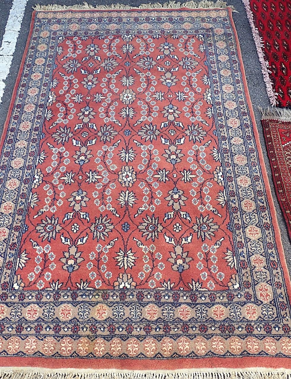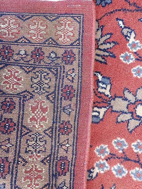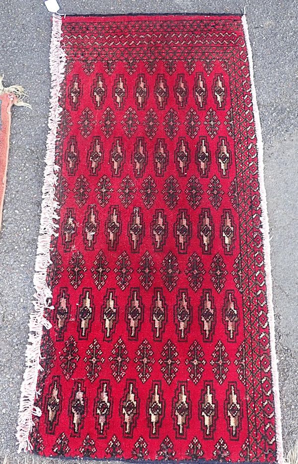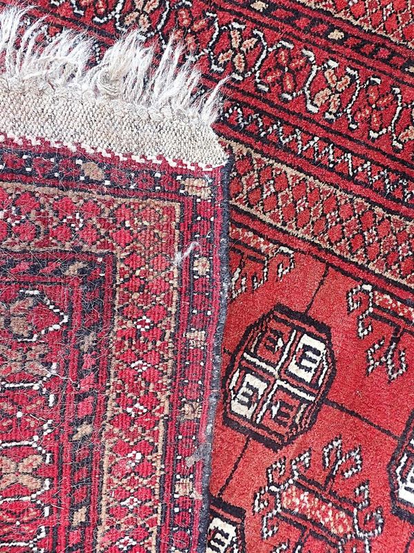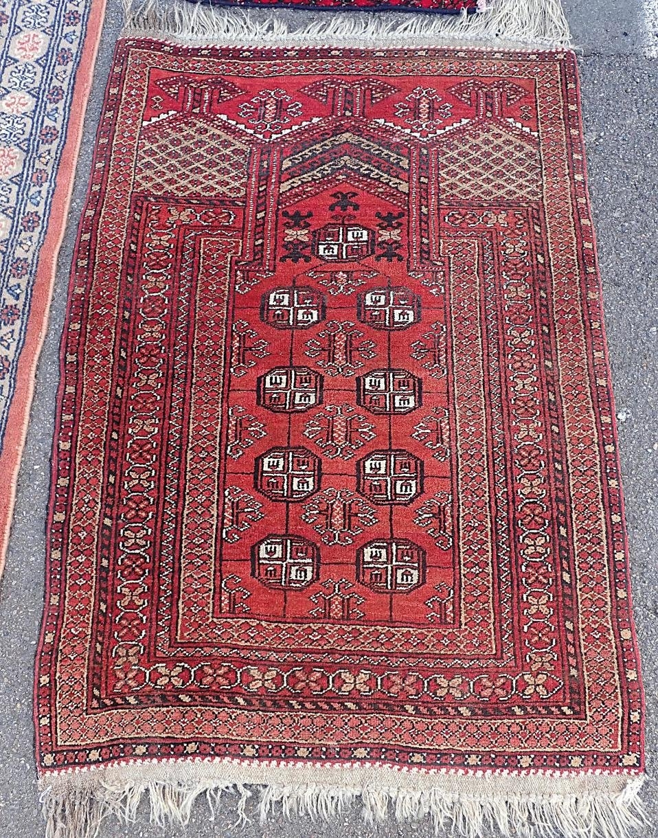 78 x 107cm plus fringes, a similar fragment 52 x 114cm (moth damaged), and a larger rug, 129 x 205cm plus fringes (3)