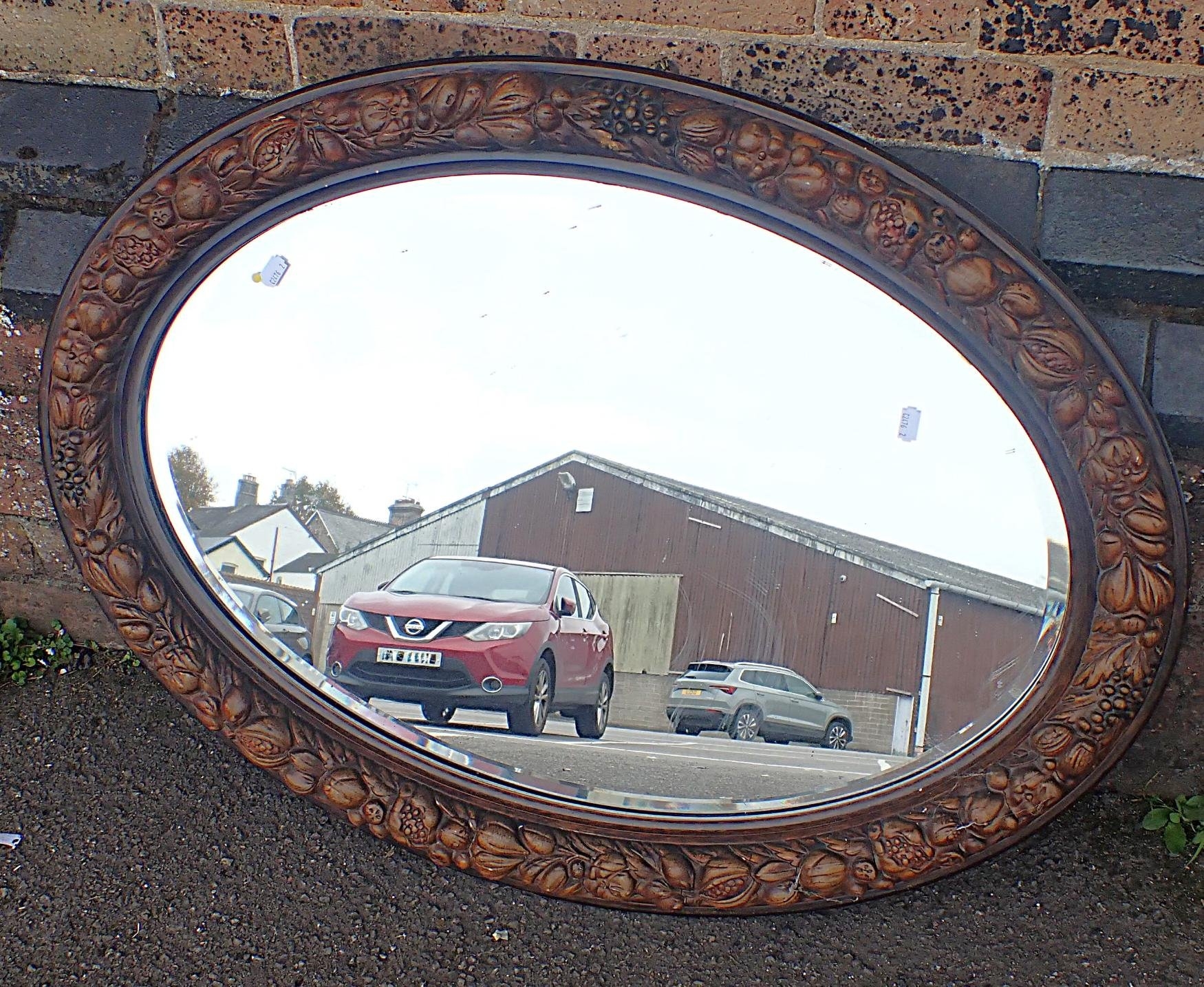 AN EDWARDIAN SIMULATED OAK OVAL WALL MIRROR