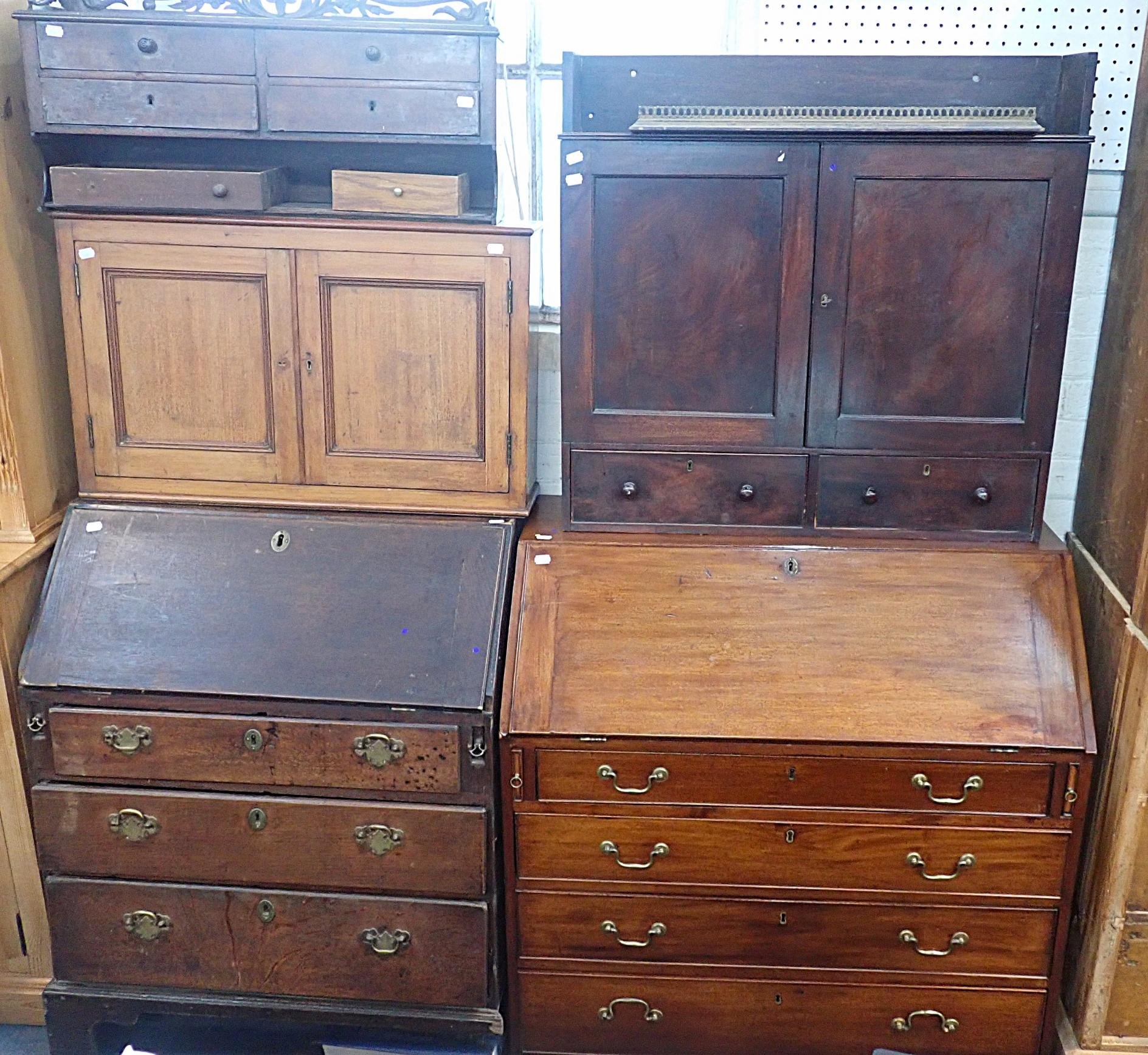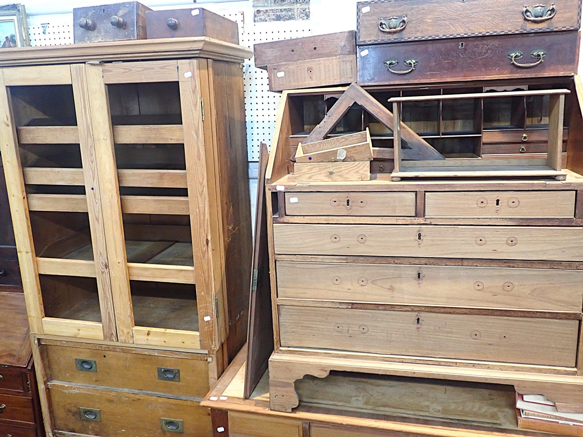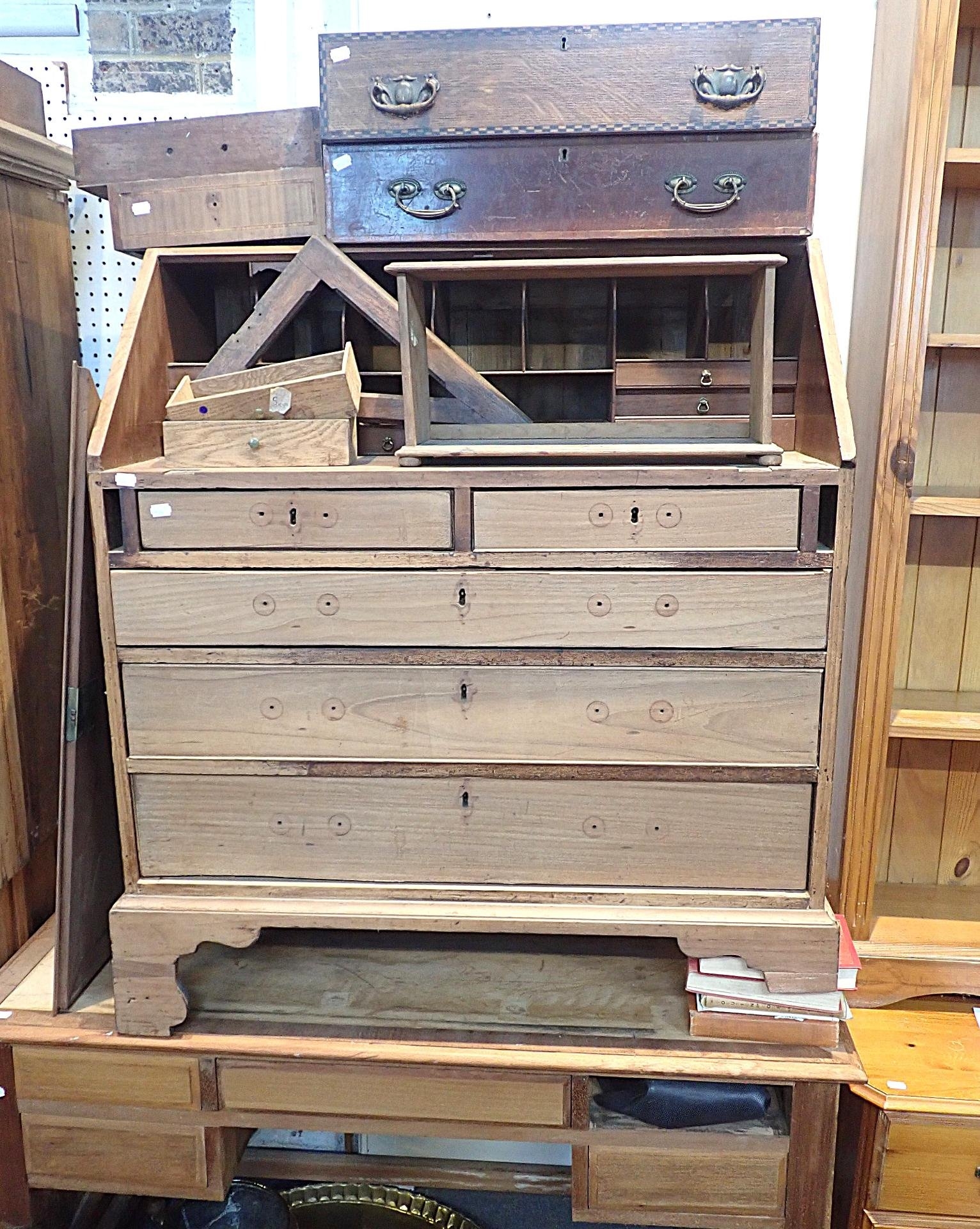 including three bureaux, a desk, wall cabinets, a partially converted wardrobe section, and other pieces (all partly restored or with missing parts