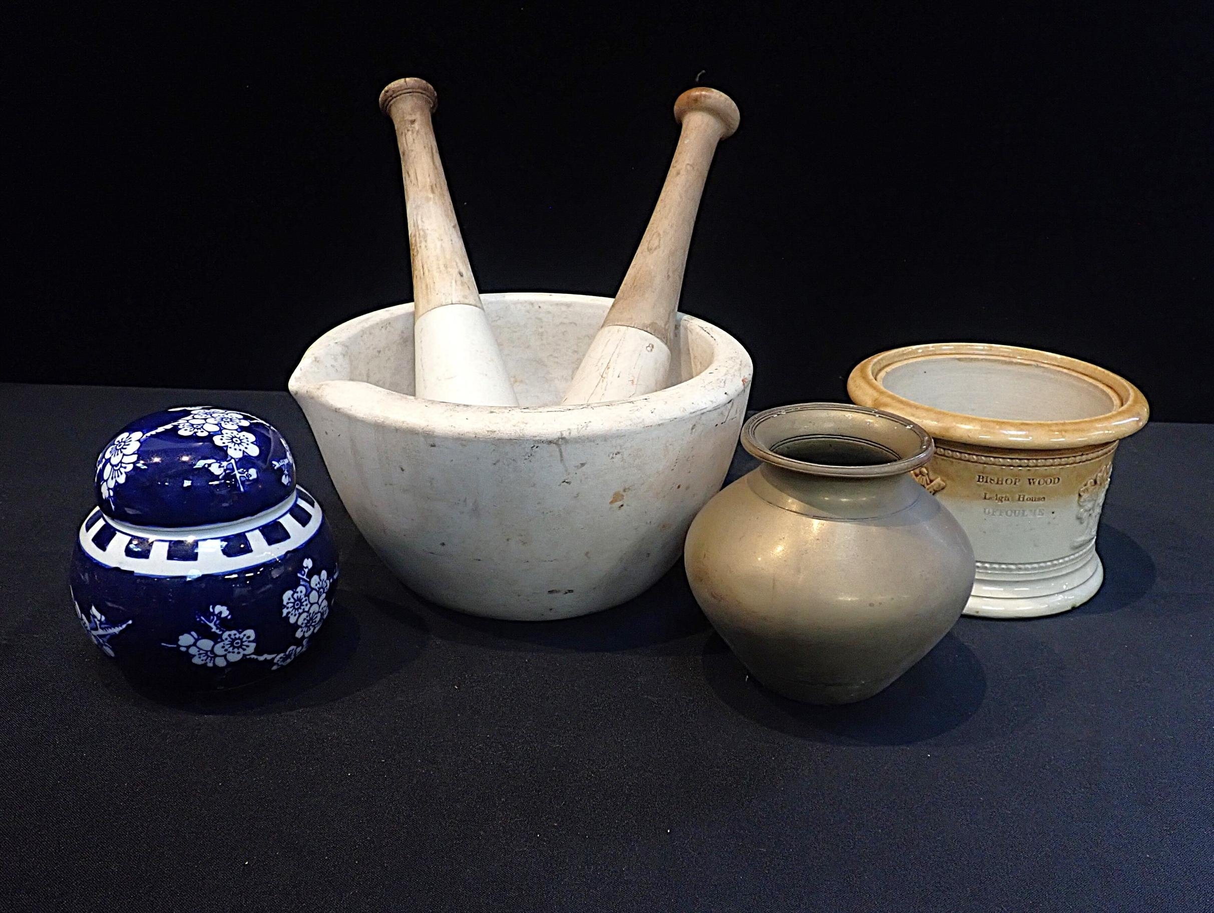 with moulded decoration; 'Bishop Wood, Leigh House, Offculme' (no lid), with a prunus ginger jar, large mortar and pestle, brass jar, and another pestle