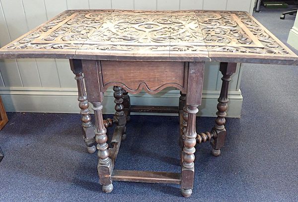 in the Renaissance revival style, and turned legs, fitted a frieze drawer, 62cm high, 61cm wide (closed)