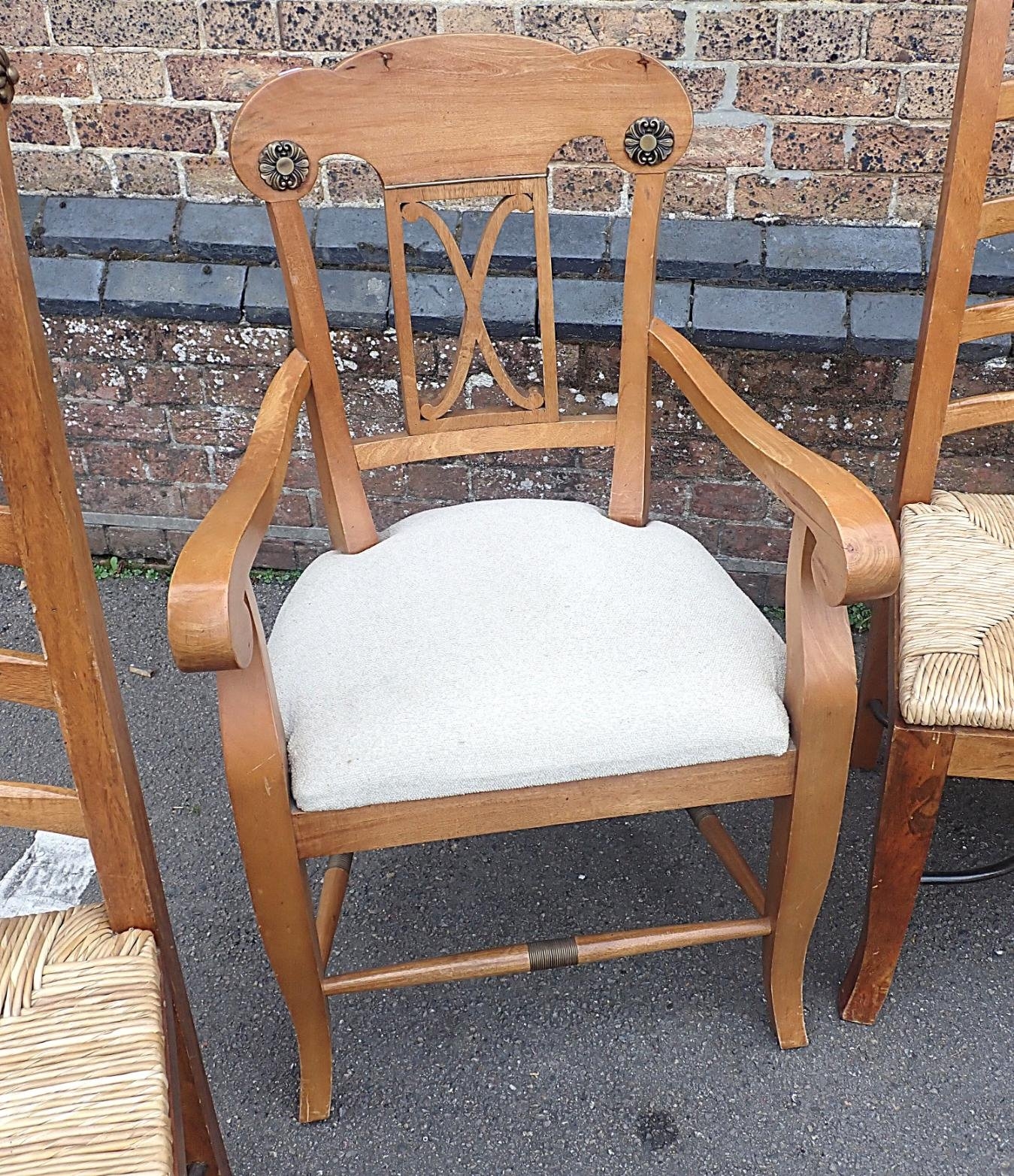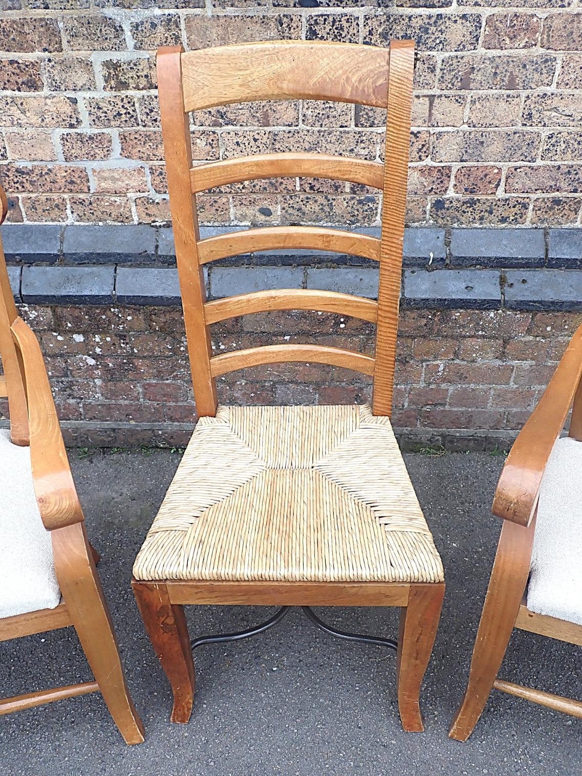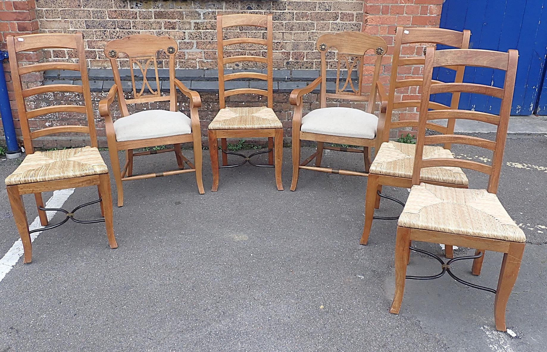 the top inset with stone pieces, on turned legs, 101 x 191cm, and six chairs with scrolling backs, including two associated carvers, the side chairs with rush seats (7)