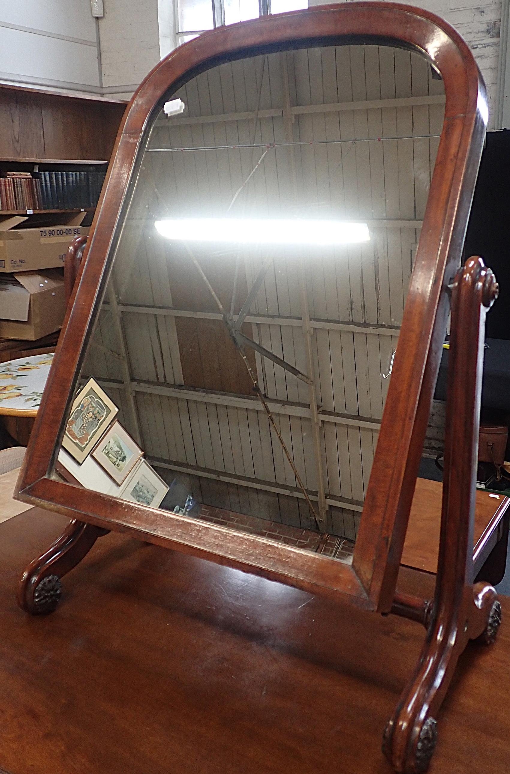 two short over three long, with incised lines, and later brass handles, and a Victorian dressing mirror with arched plate and scrolling frame (later paterae) (2)