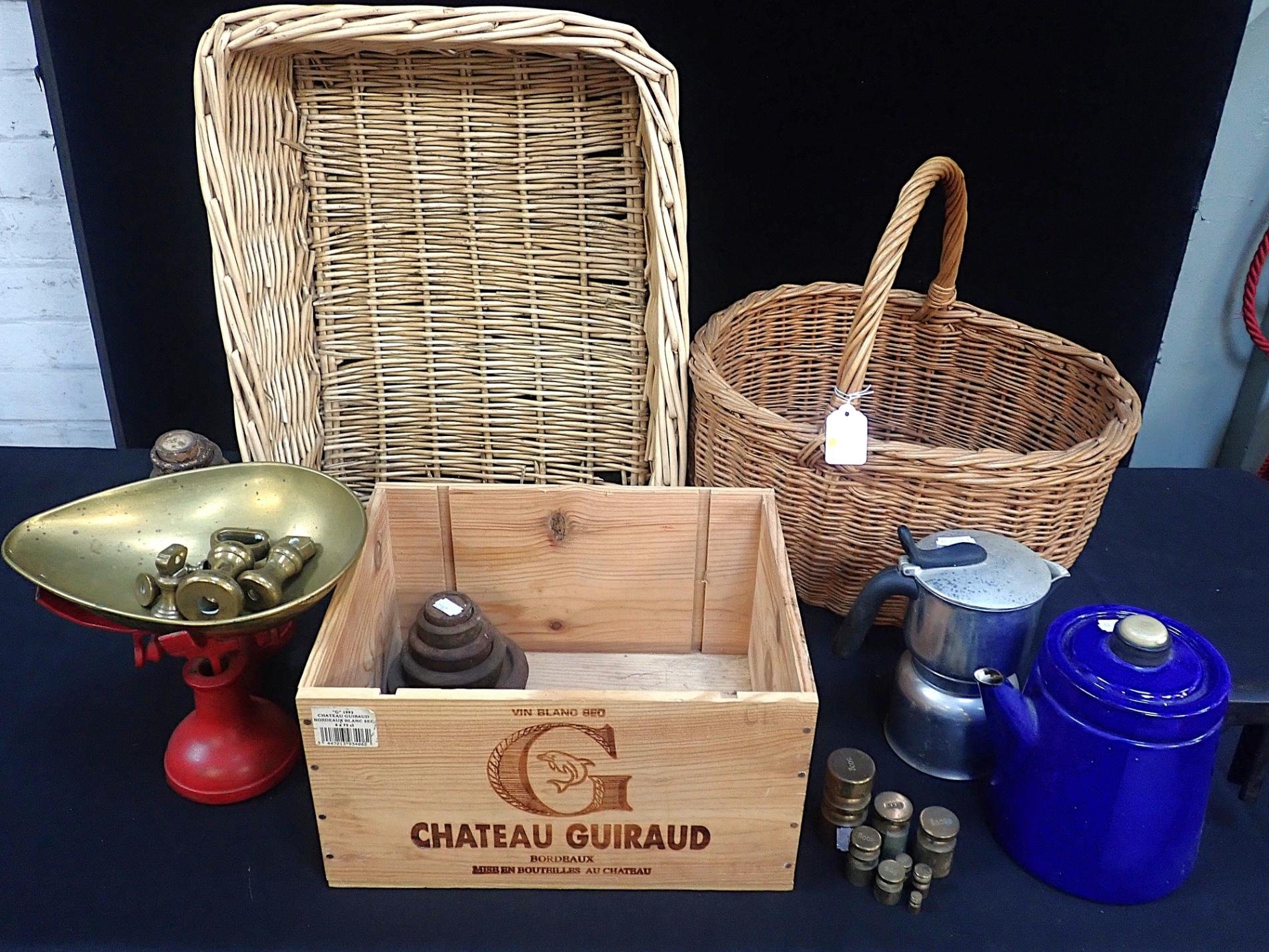 another set of brass weights, a kitchen scale, a vintage shopping basket, and other items