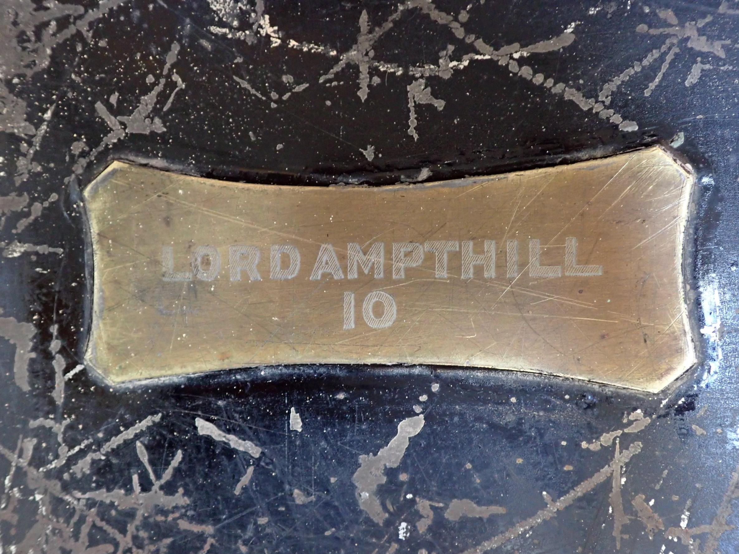 (repaired, woodworm), and two japanned tin uniform trunks, one with brass plaque; 'Lord Ampthill 10' (3)