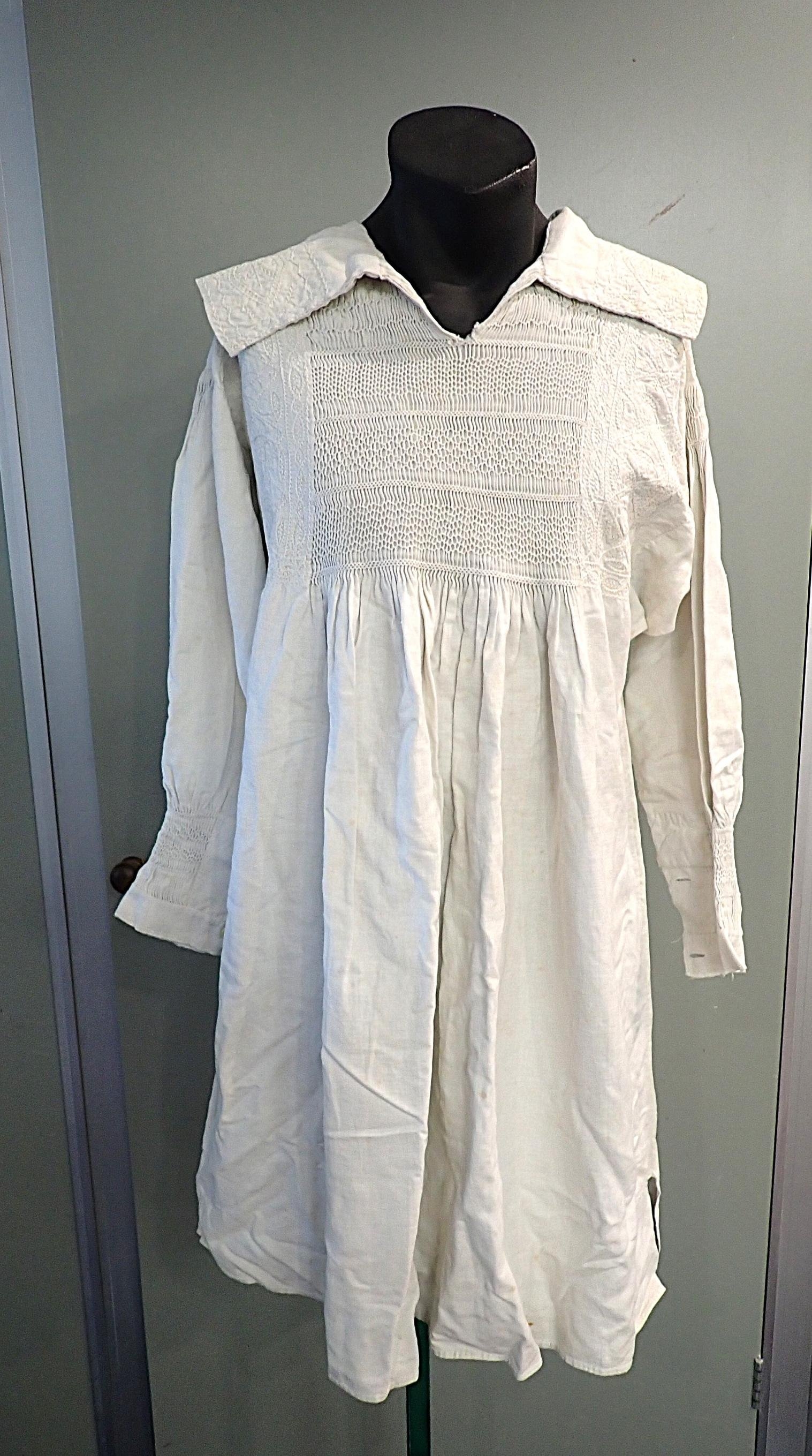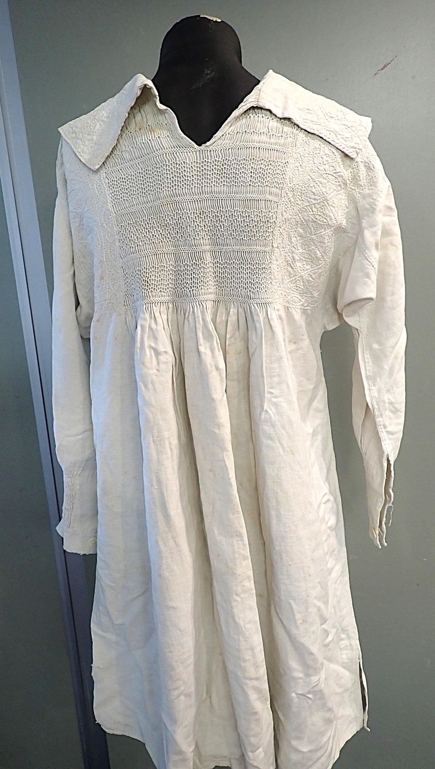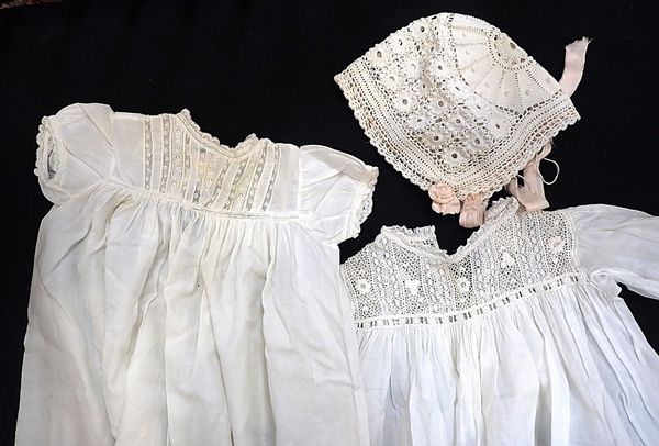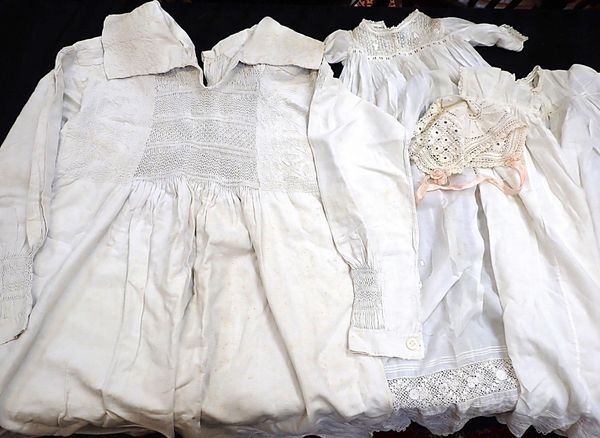 with traditional smocked front, back and cuffs, and with additional whitework embroidery, with a lace-trimmed baby's gown, another similar, and a bonnet (4)