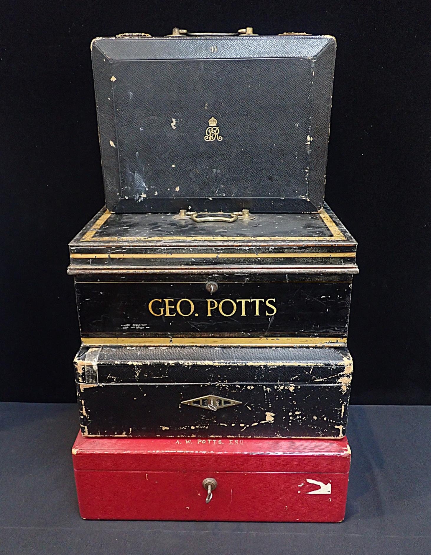 (with key) two others in black with GR V cypher (one with key), all by J. Peck and Son, and a japanned tin deed box 'Geo. Potts' (4)