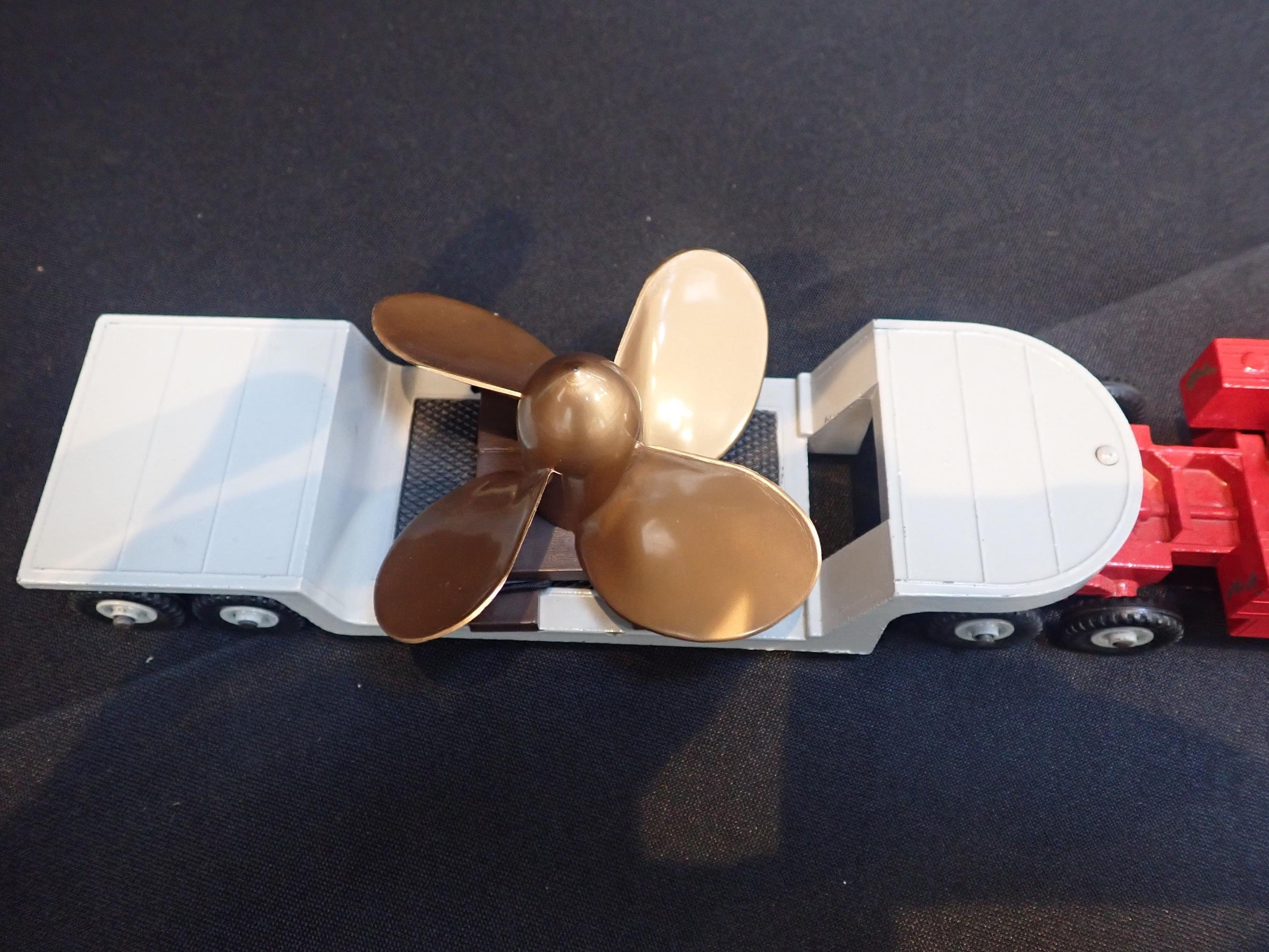 comprising; red tractor unit with grey low loader trailer and matching grey Supertoys hubs, with pallet and bronze plastic propeller load, in the original blue & white striped box with original inner packing cardboard inlay (overall good condition)