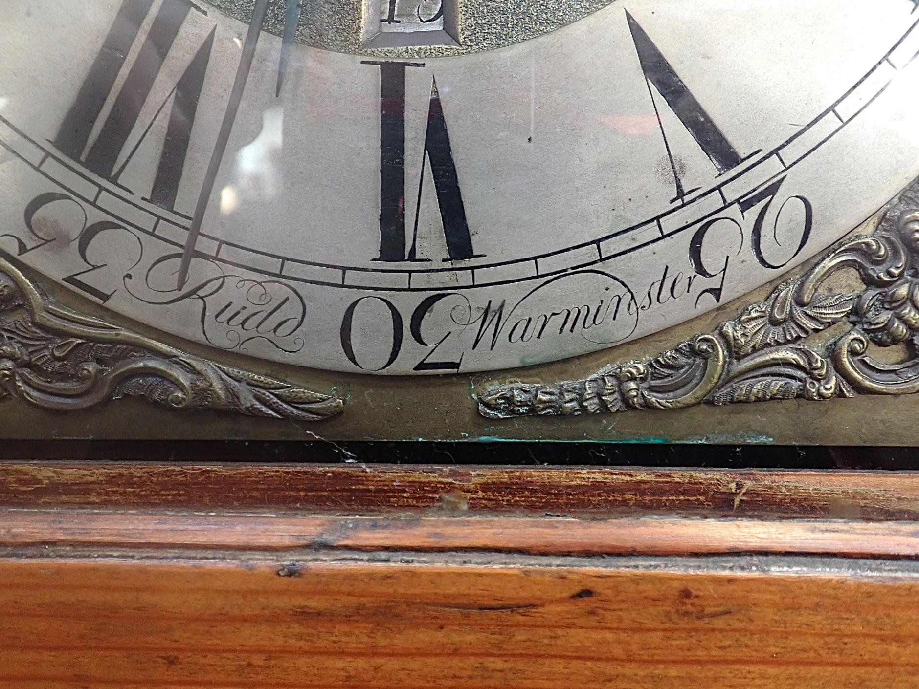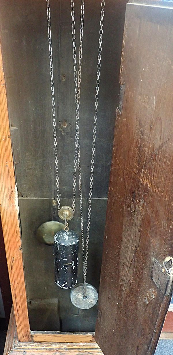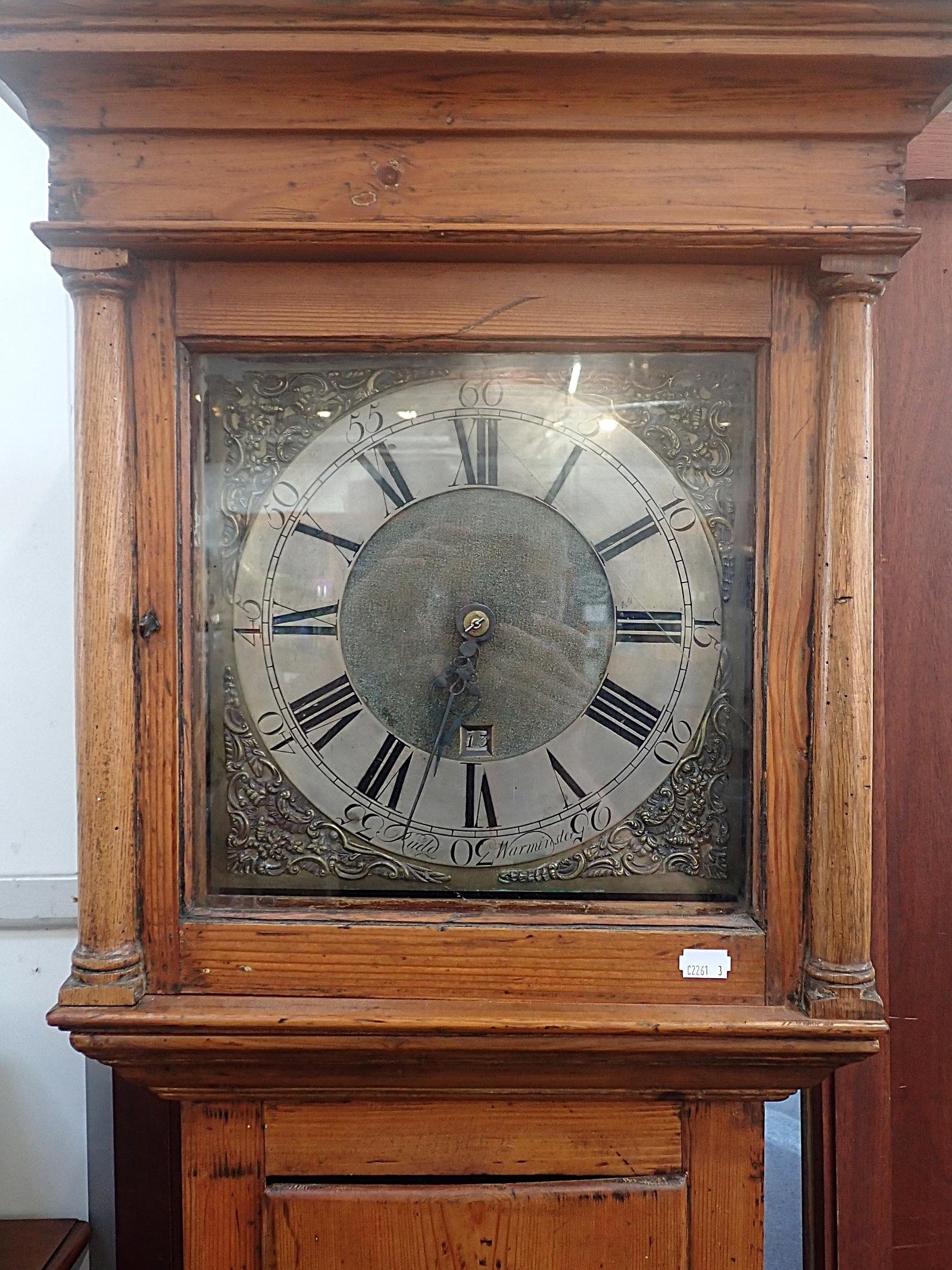 with 28cm square dial, silvered chapter ring and cast spandrels, in stripped pine case (leans forward, but runs)