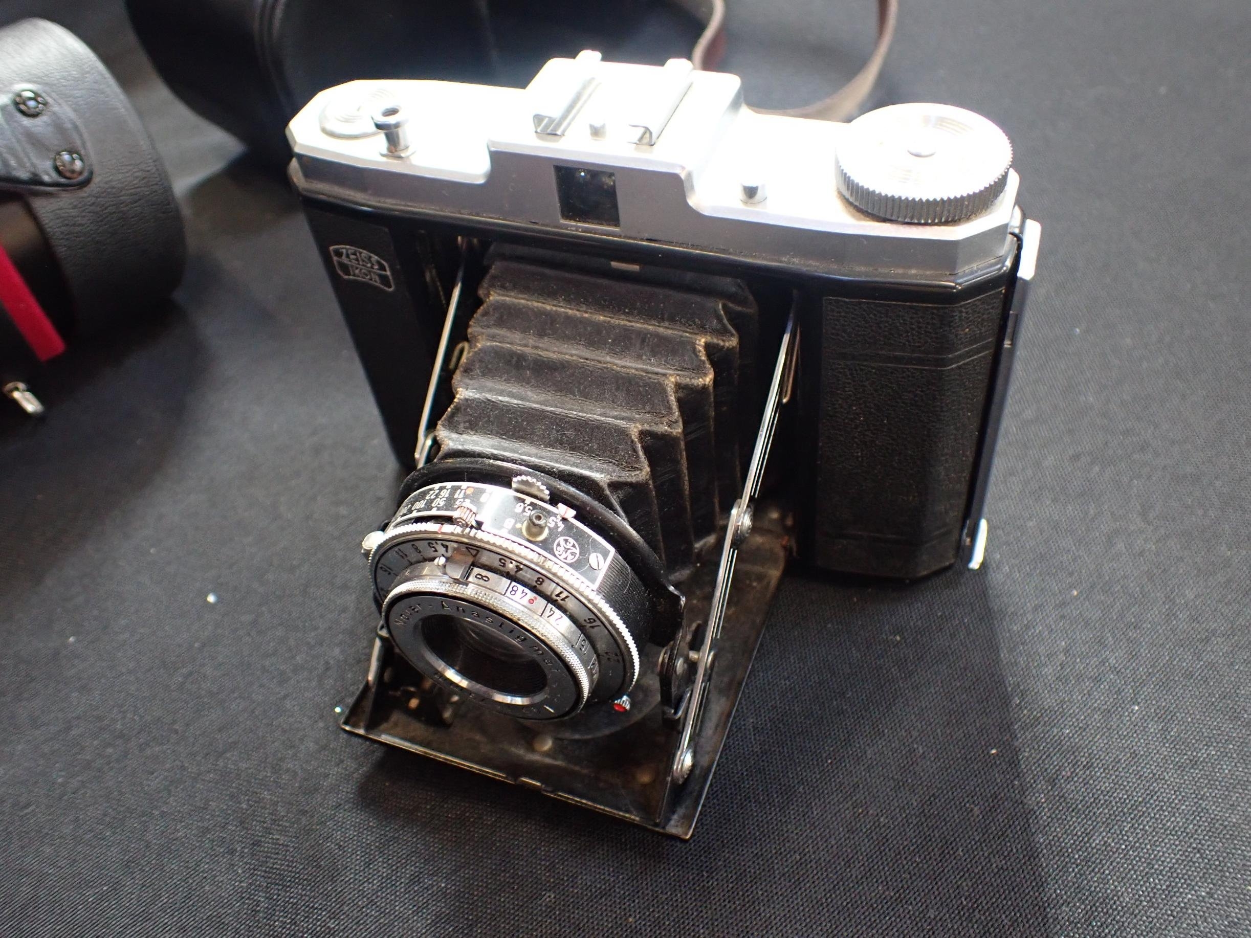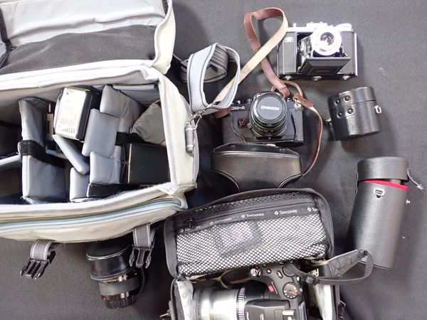 a 1:4.5 Miranda MC zoom lens, an Auto Chinon 1:1.9 50mm lens, Zeiss Ikon Nettar Pronto bellows camera, Vivitar 2x Matched multiplier, Fuji FinePix S602 Zoom Digital camera, and other items