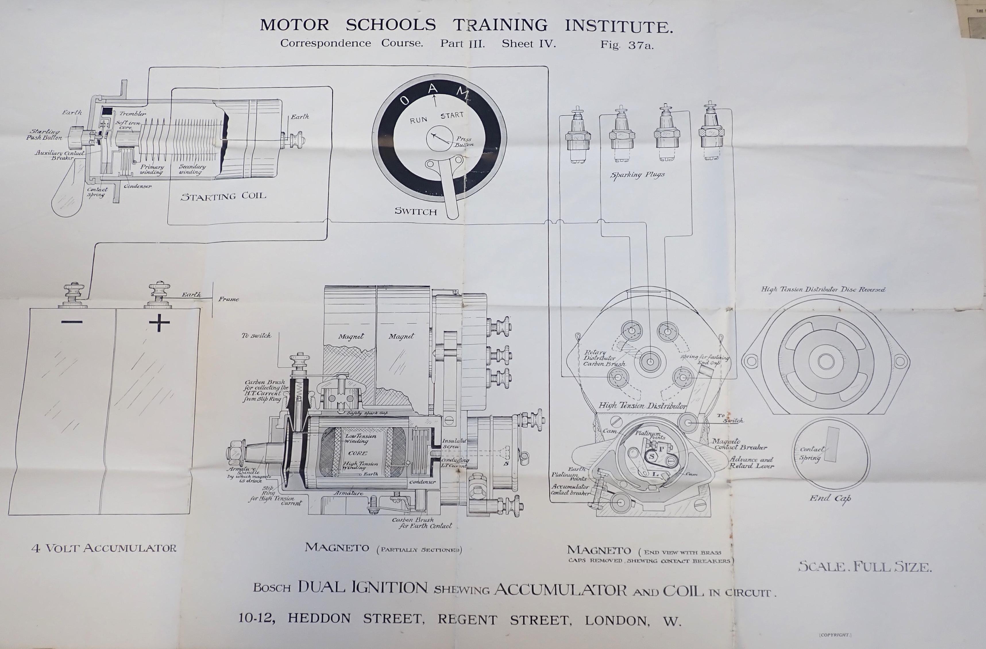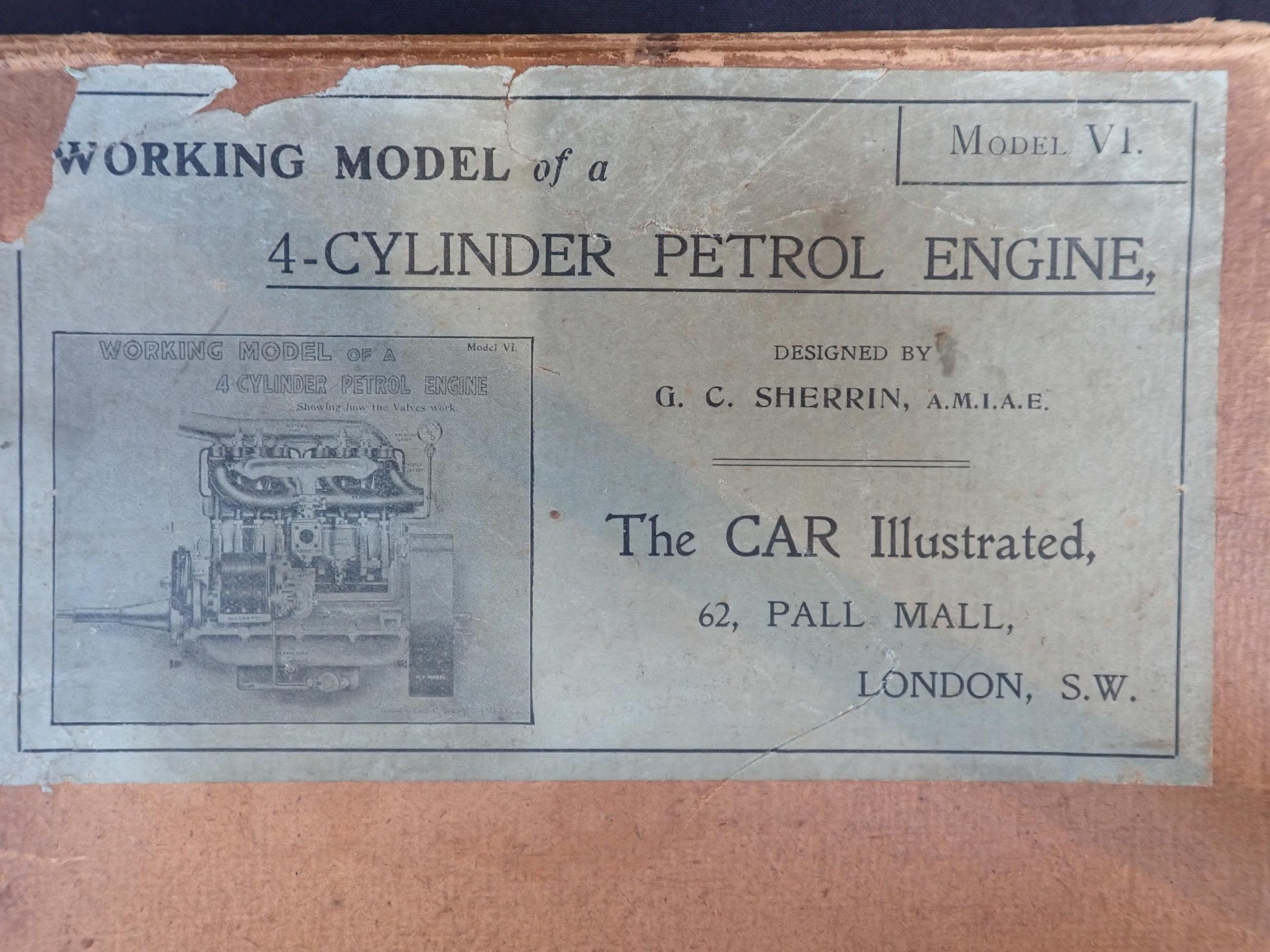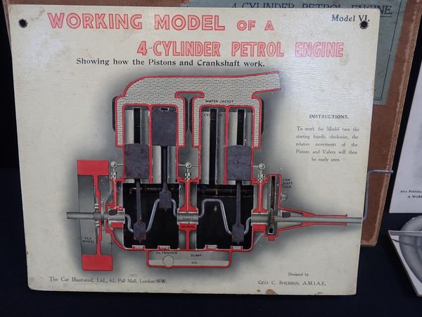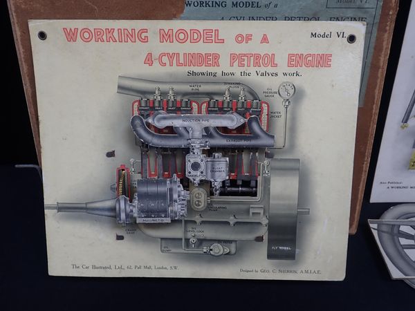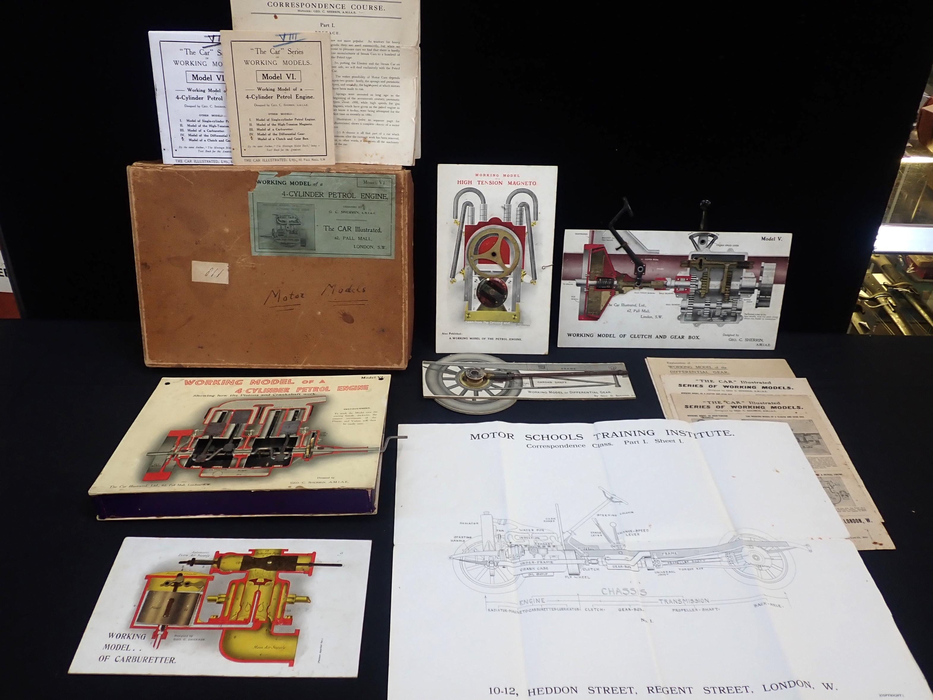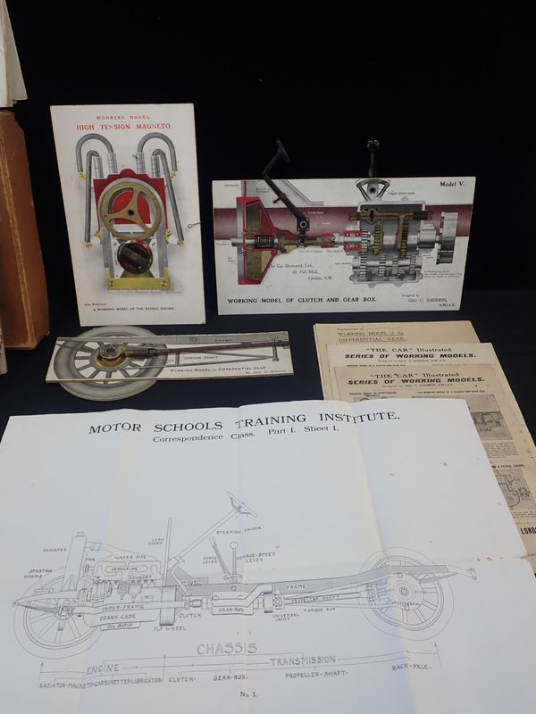 five articulated card and metal models, II, III, IV, V, and VI; High tension magneto, Carburettor, Differential gear, Clutch and gear box, and 4- cylinder petrol engine, designed by Geo. C. Sherrin, with some explanatory sheets, and one an original box, and Part 1 of Motor Schools Ltd Training Institute Correspondence Course; early 20th century (lacking model I, some wear and rust commensurate with age)