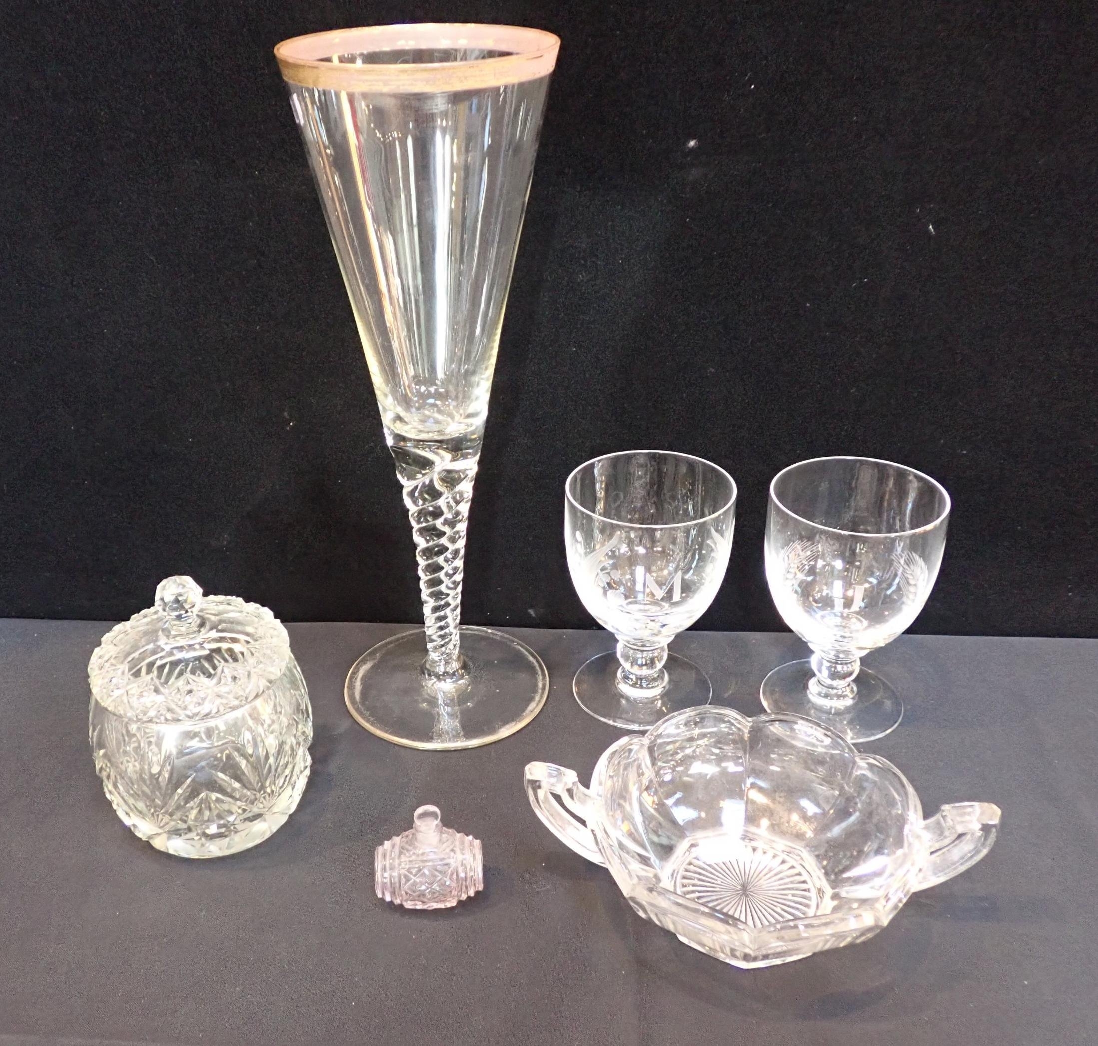 of 19th century style, engraved, and with the initials 'M' and 'J' respectively, with a cut glass jar, a miniature cut glass barrel, a trumpet vase with gilt rim, and a pressed glass dish (6)