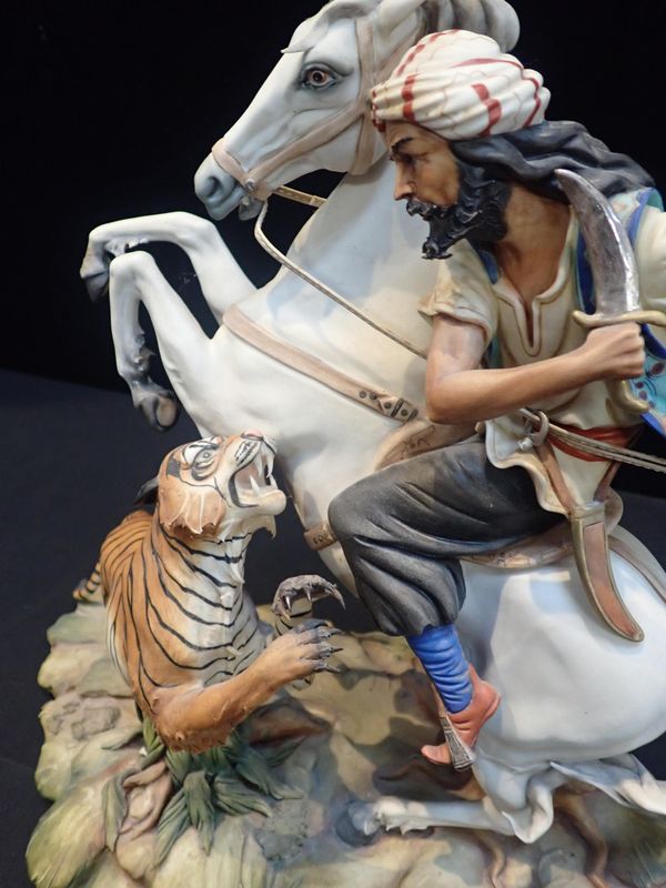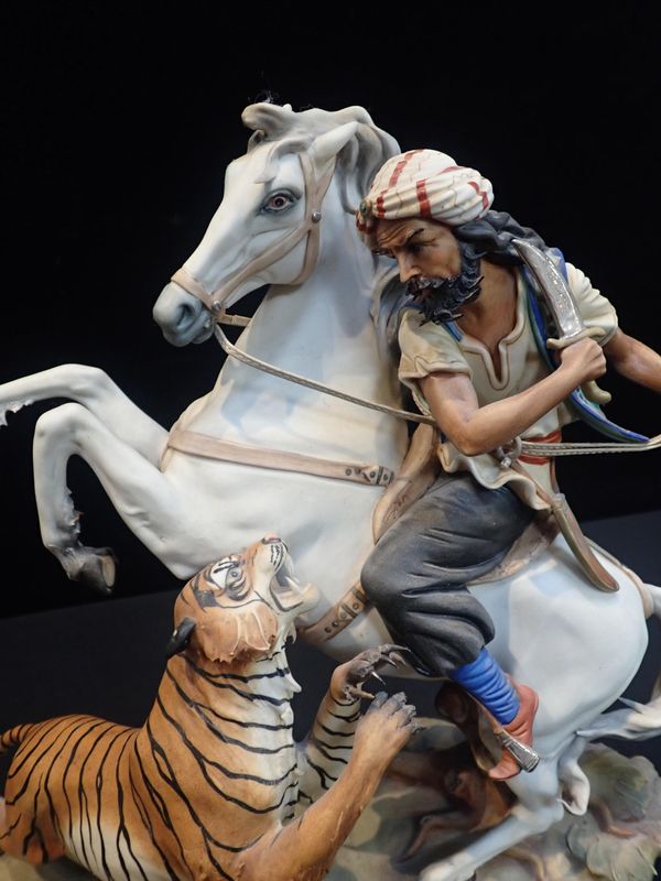 CAPODIMONTE FIGURE OF A HORSEMAN ATTACKED BY A TIGER