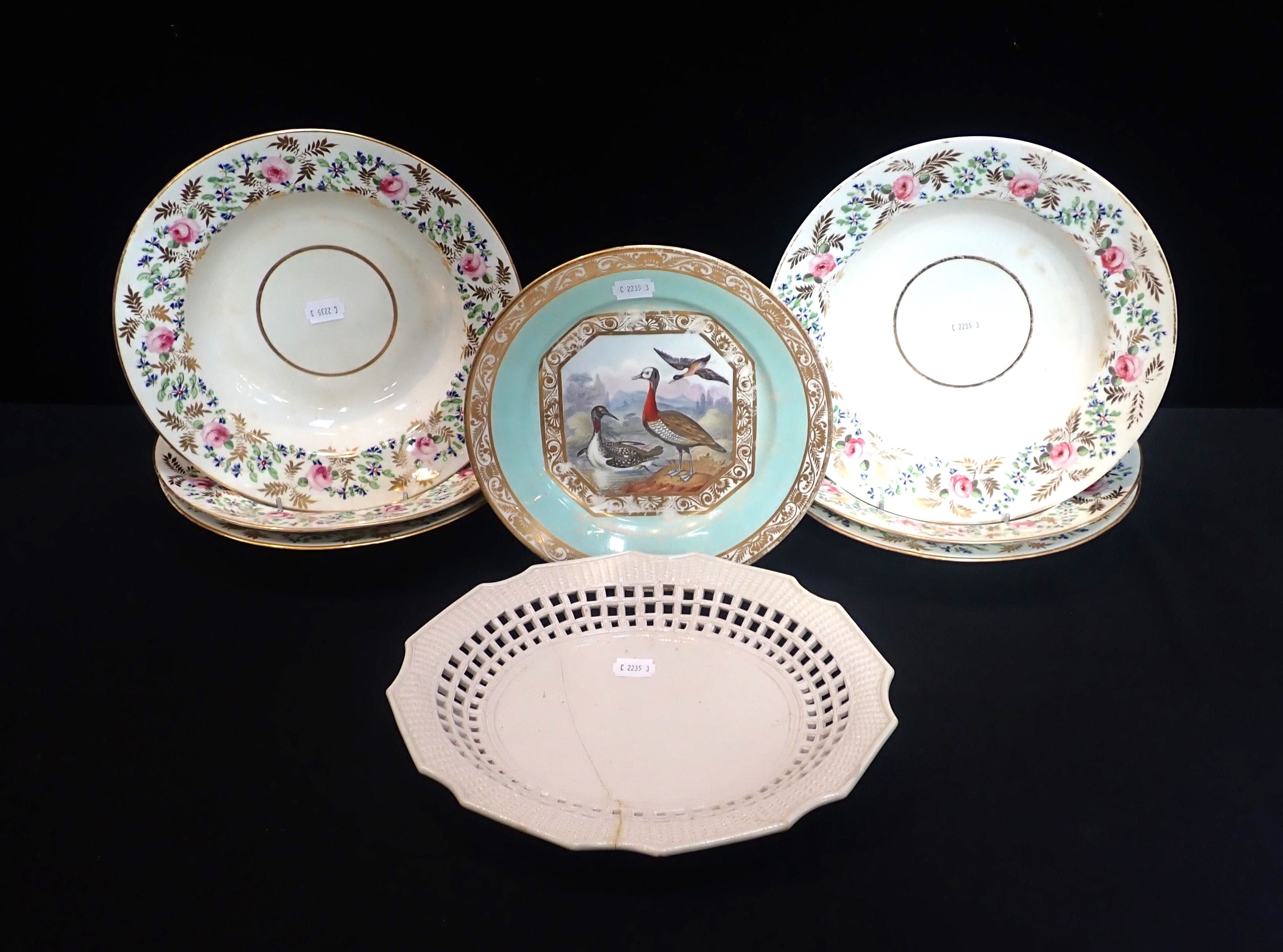 22cm dia, with six Derby floral border soup plates and a Staffordshire stoneware pierced dish (repaired)