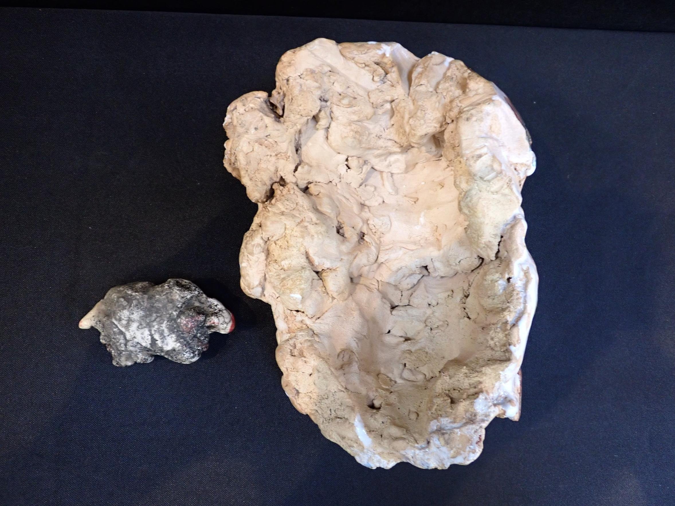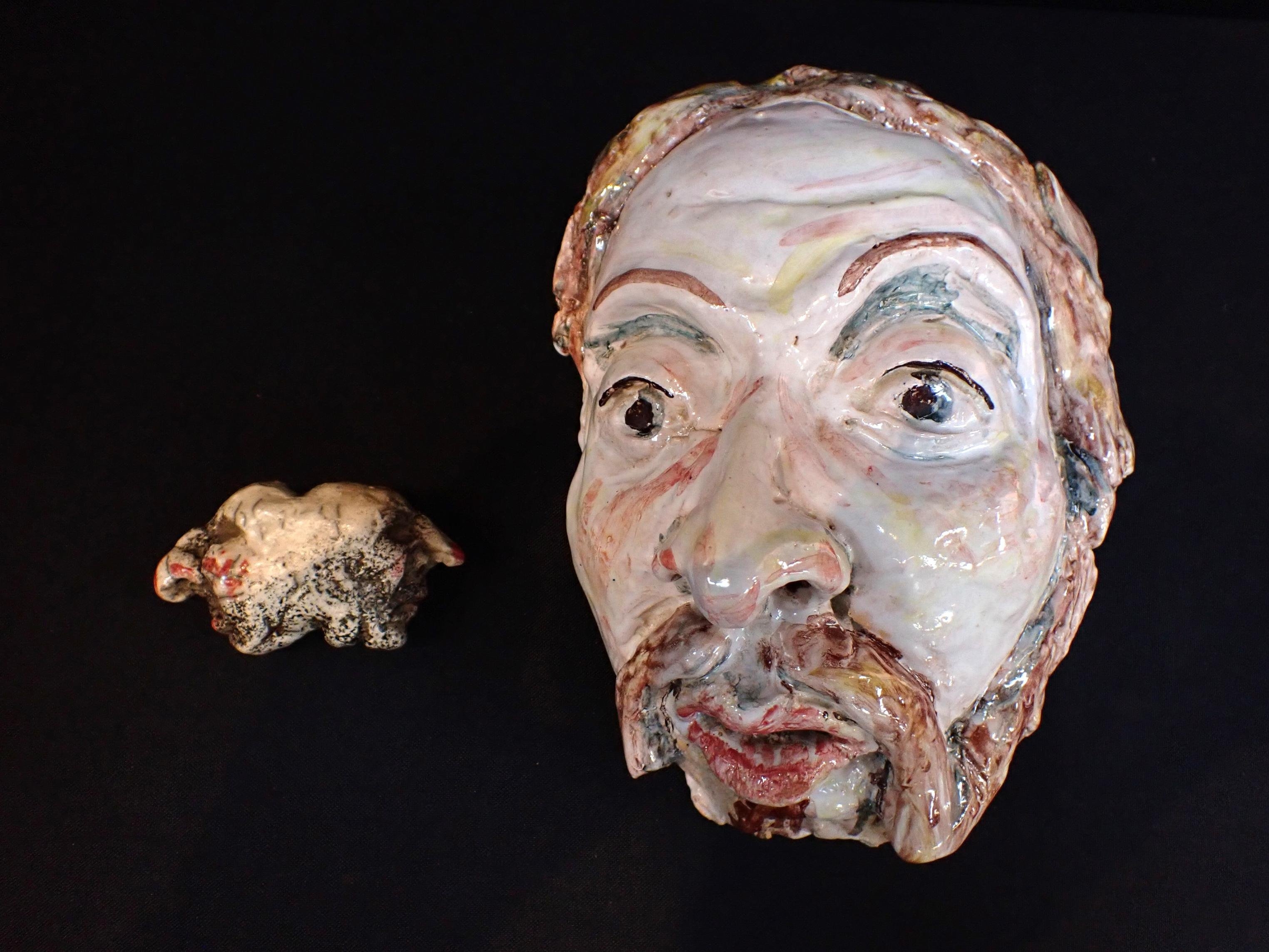 in glazed ceramic, 22cm long, and a small Raku fired double faced head, 8.5cm long (2) Both given to the vendor by the artist